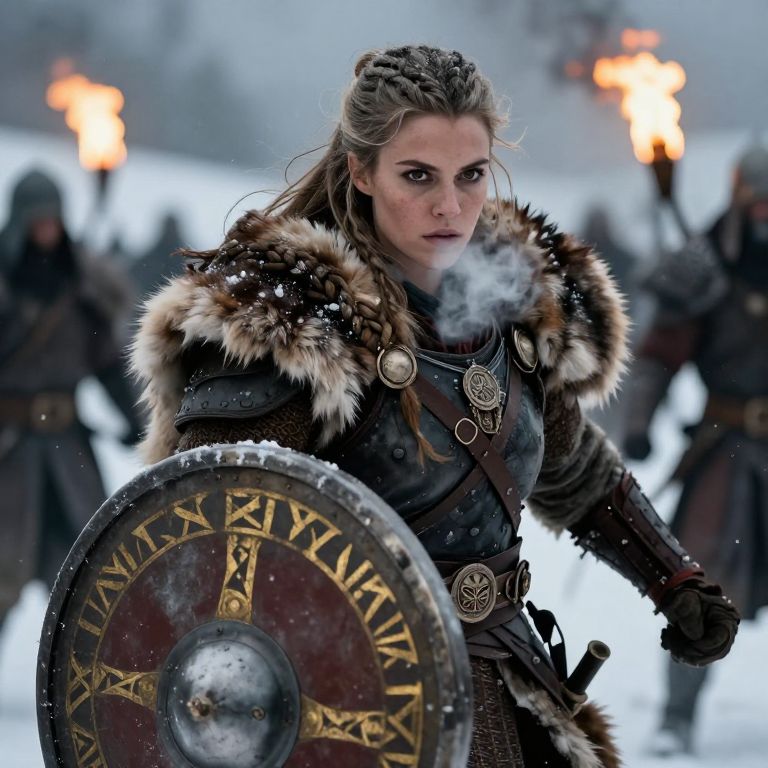 Photograph of a fierce, blonde woman warrior in a snowy battlefield. She has braided hair, intense eyes, and wears a fur-trimmed leather armor with silver medallions. She holds a large, round, metal shield with gold runes and a dark red center. Her right hand grips a sword, and her breath is visible in the cold air. In the blurred background, other warriors with torches are visible, creating a sense of urgency and action. The snow-covered ground and overcast sky add to the cold, wintry atmosphere. The image has a dramatic, action-packed feel, reminiscent of a fantasy or medieval setting.