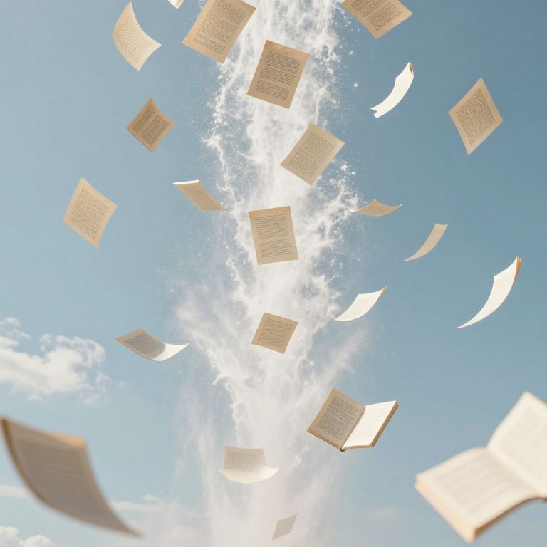 Photograph-like CGI image of beige, rectangular, open books and white feathers floating upwards against a bright blue sky with scattered white clouds. The books are distributed unevenly, appearing to be carried by a gentle breeze. The feathers are spread throughout the image, adding a sense of lightness and freedom. The sun is partially visible behind the clouds, creating a radiant, glowing effect. The overall composition conveys a feeling of uplift and tranquility.