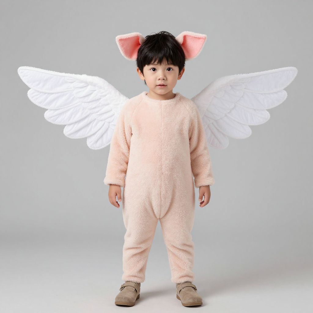 Flying pig costume toddler, solo, wings, male focus, cosplay, 1boy, kigurumi, full body, black hair, looking at viewer, realistic, fairy wings, standing, fairy