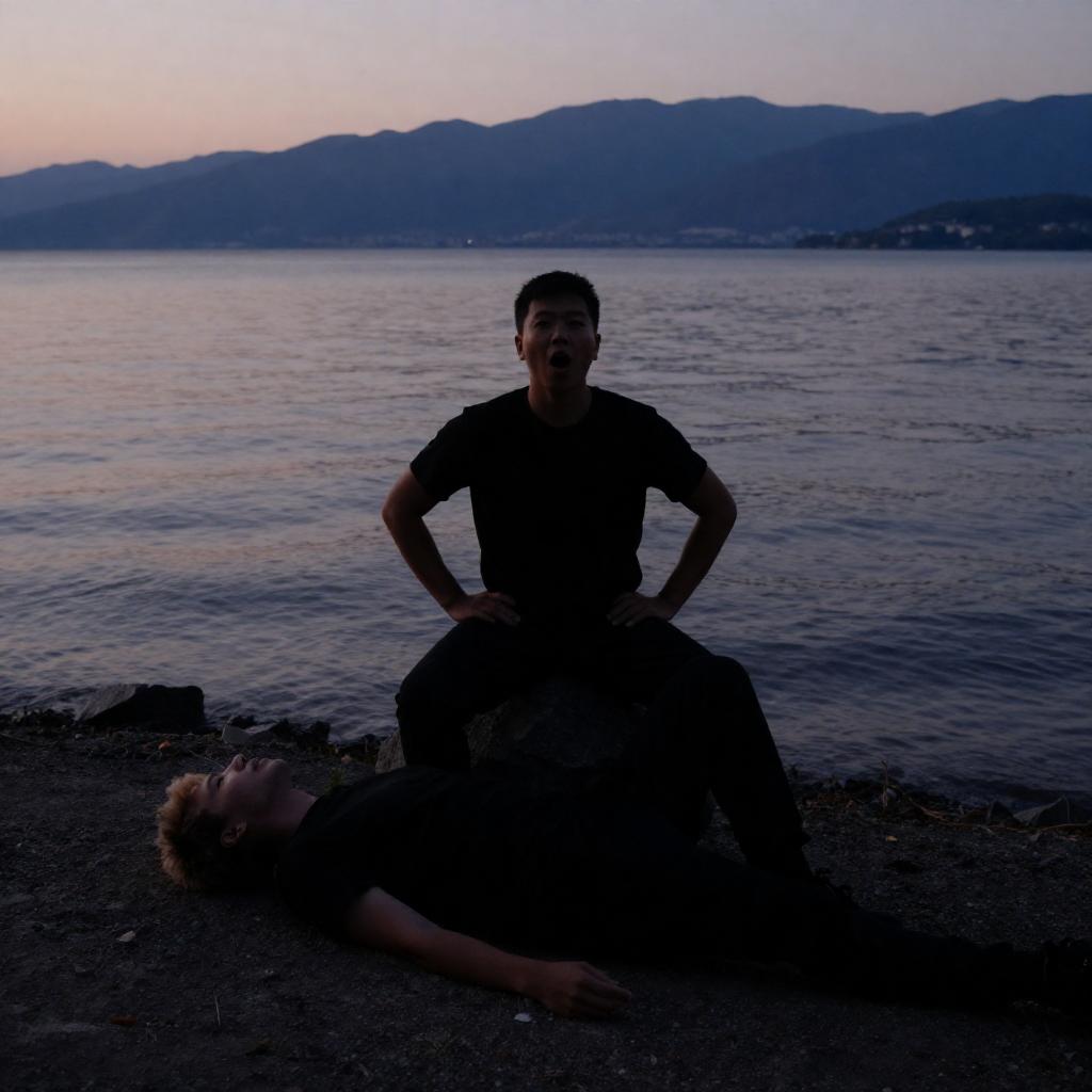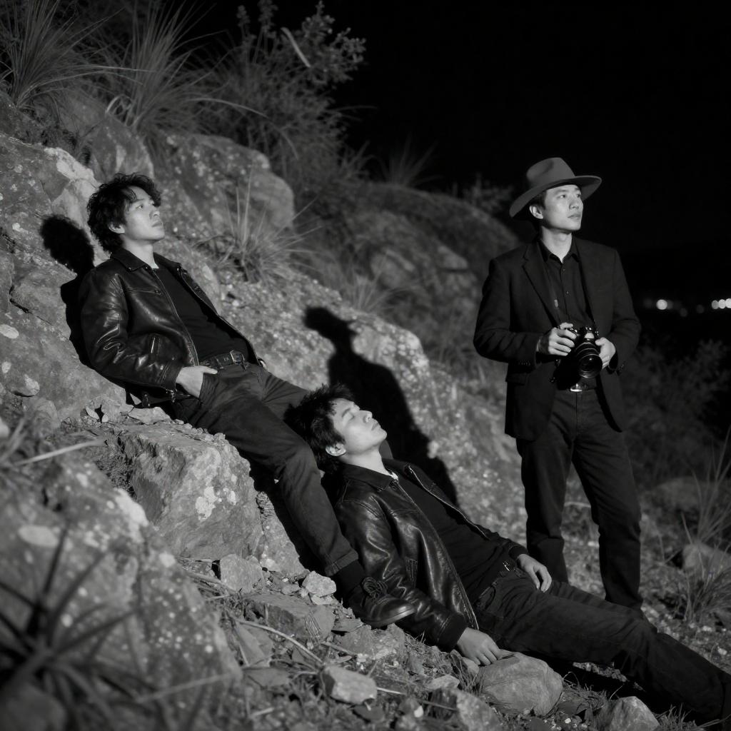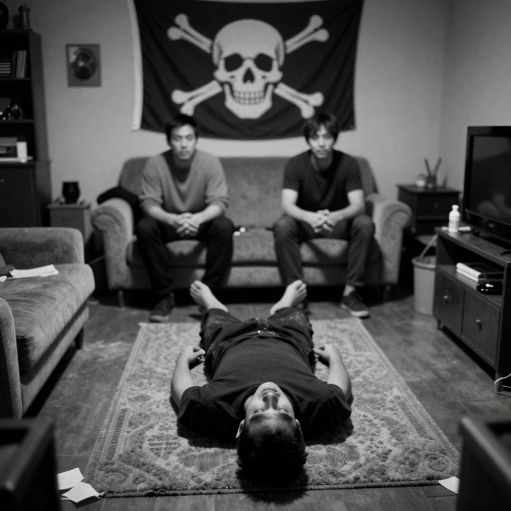 Black-and-white photograph of a man lying on the floor with a skull and crossbones flag above him, while two people sit on a couch in the background. The man on the floor wears dark clothes, while the two seated individuals wear casual attire. The room has a cluttered, lived-in feel with various objects and a TV on the right.