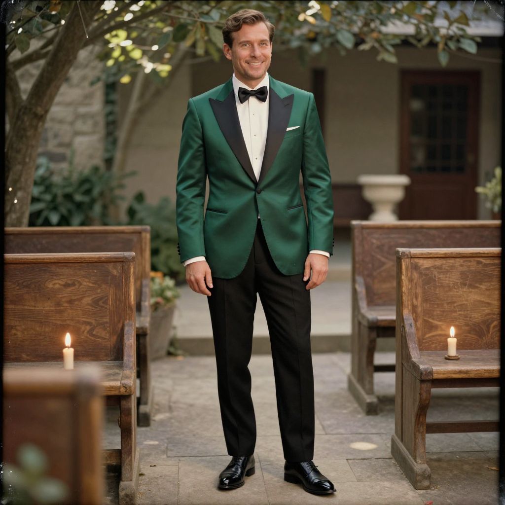 A man, emerald green silk tuxedo jacket, ivory dress shirt, black silk bow tie, tailored black wool trousers, classic black leather derby shoes, sun-drenched courtyard, rustic wooden pews, flickering candlelight, calotype process, confident smile. Man has masculine face and piercing eyes