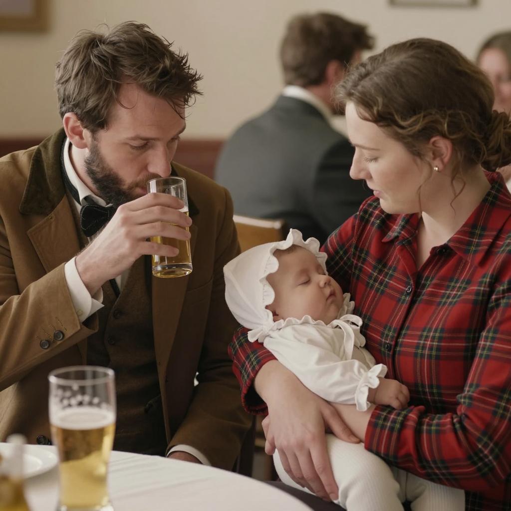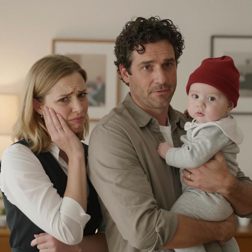 Photograph of three people. Middle-aged man with dark curly hair, light brown shirt, holding baby in grey clothes and red hat. Woman with blonde hair, white blouse, black pinafore, hand on cheek, looking slightly annoyed. Warm indoor light, soft-focus background with framed picture and lamp. Baby looking at camera, man looking ahead. Three people, close interaction, baby on right, woman on left, man in center.