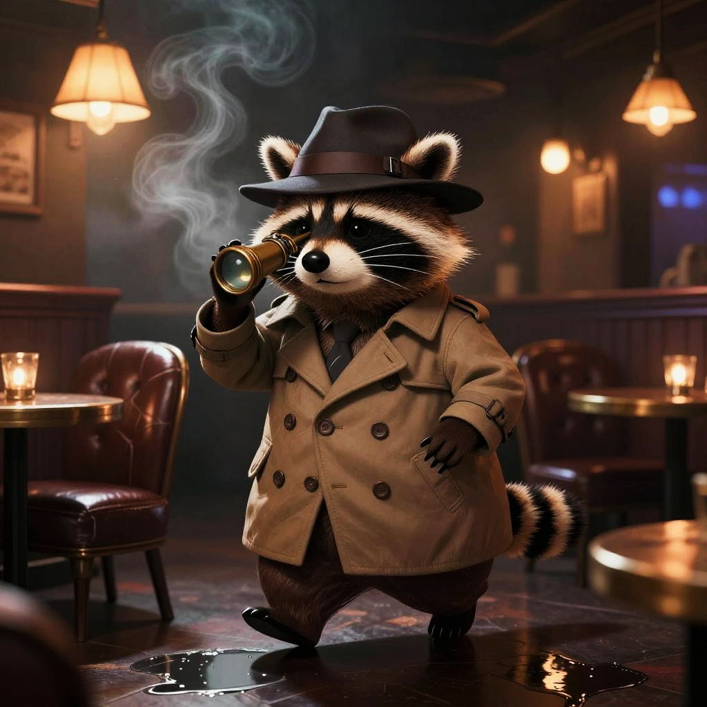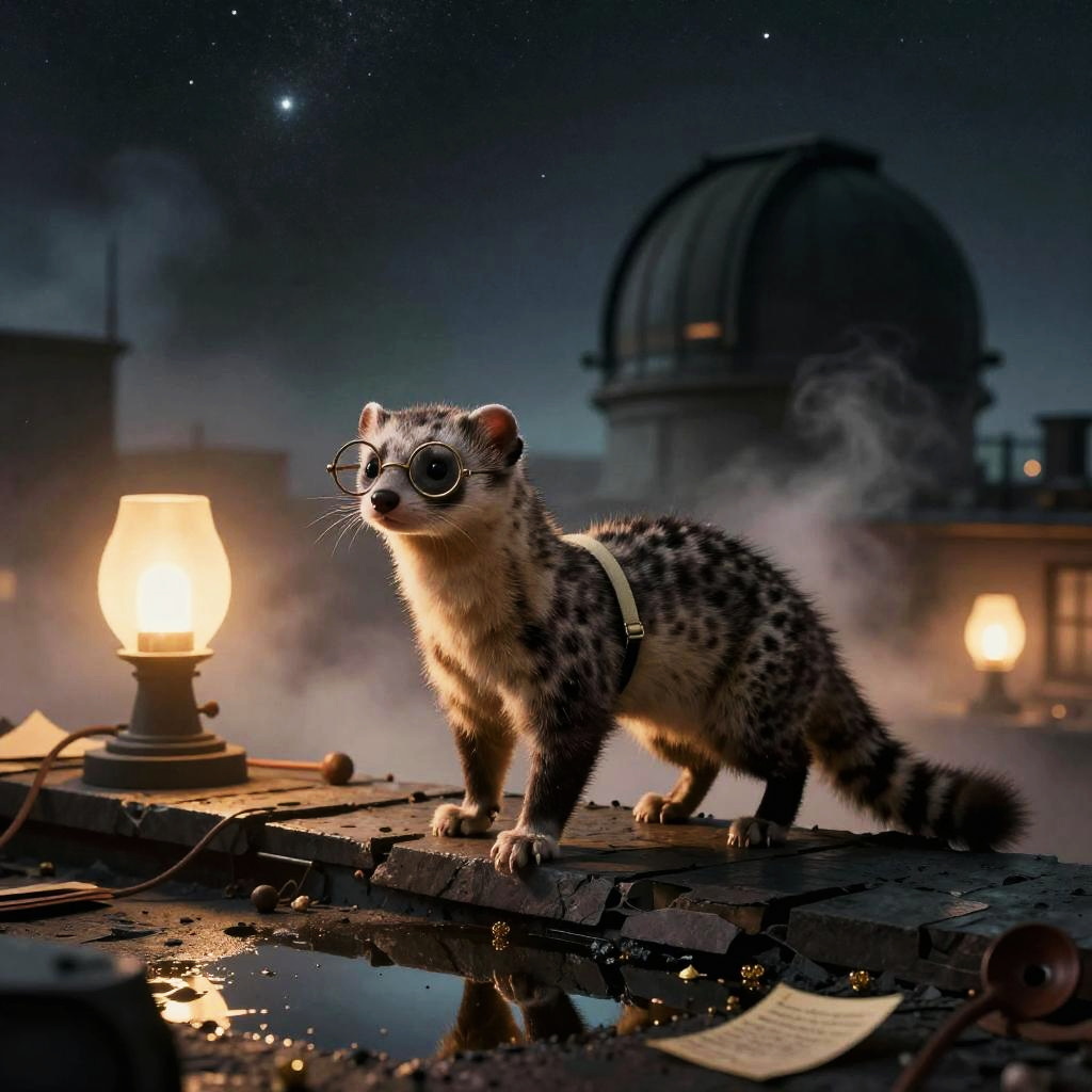 Nimble spotted genet detective in suspenders and round spectacles navigates crumbling rooftop observatory silhouetted against a starry sky with lingering mist, under moody lamps and drifting mist; noir atmosphere with a whimsical twist and cozy intrigue. Rendered in vintage pulp halftone. Reflective puddles, dramatic rim light, soft film grain, volumetric fog, shallow depth of field, gentle vignetting, tactile textures, subtle glowing clues.
