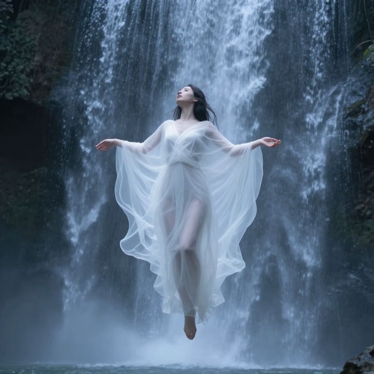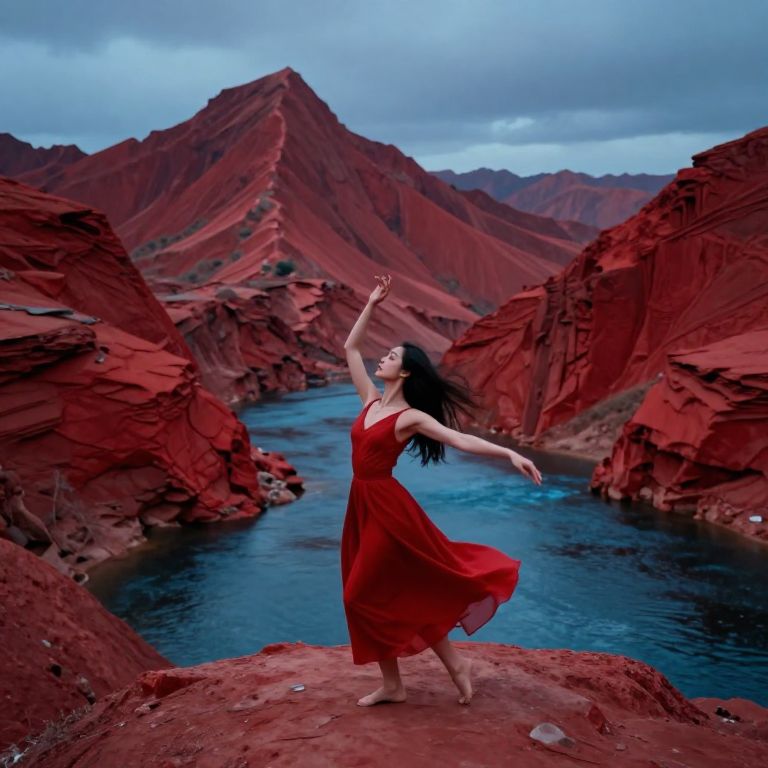 Photograph of a woman with long black hair, wearing a flowing red dress, standing barefoot on a red rock ledge. She is posing with arms raised and one leg slightly bent, exuding a sense of freedom and grace. The background features a striking landscape of red, jagged mountains with a deep blue river winding through the valley. The sky is overcast with gray clouds, contrasting with the vibrant reds and blues. The image captures a dramatic, almost surreal beauty, blending the natural elements with the woman's dynamic pose.