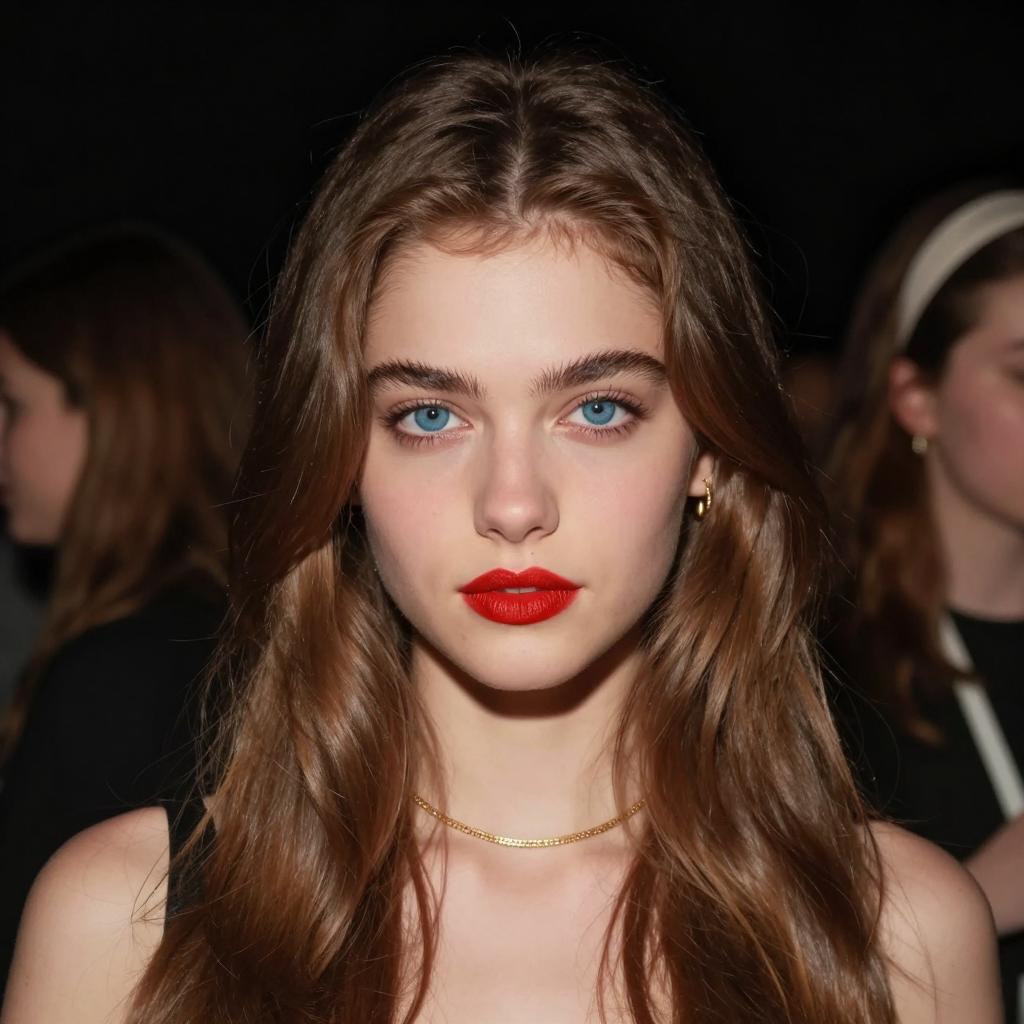 Young woman with long, wavy brown hair, intense blue eyes, red lipstick, wearing a gold necklace, in a dimly lit room. Background includes blurred figures, one with brown hair and another with long hair wearing a white headband.