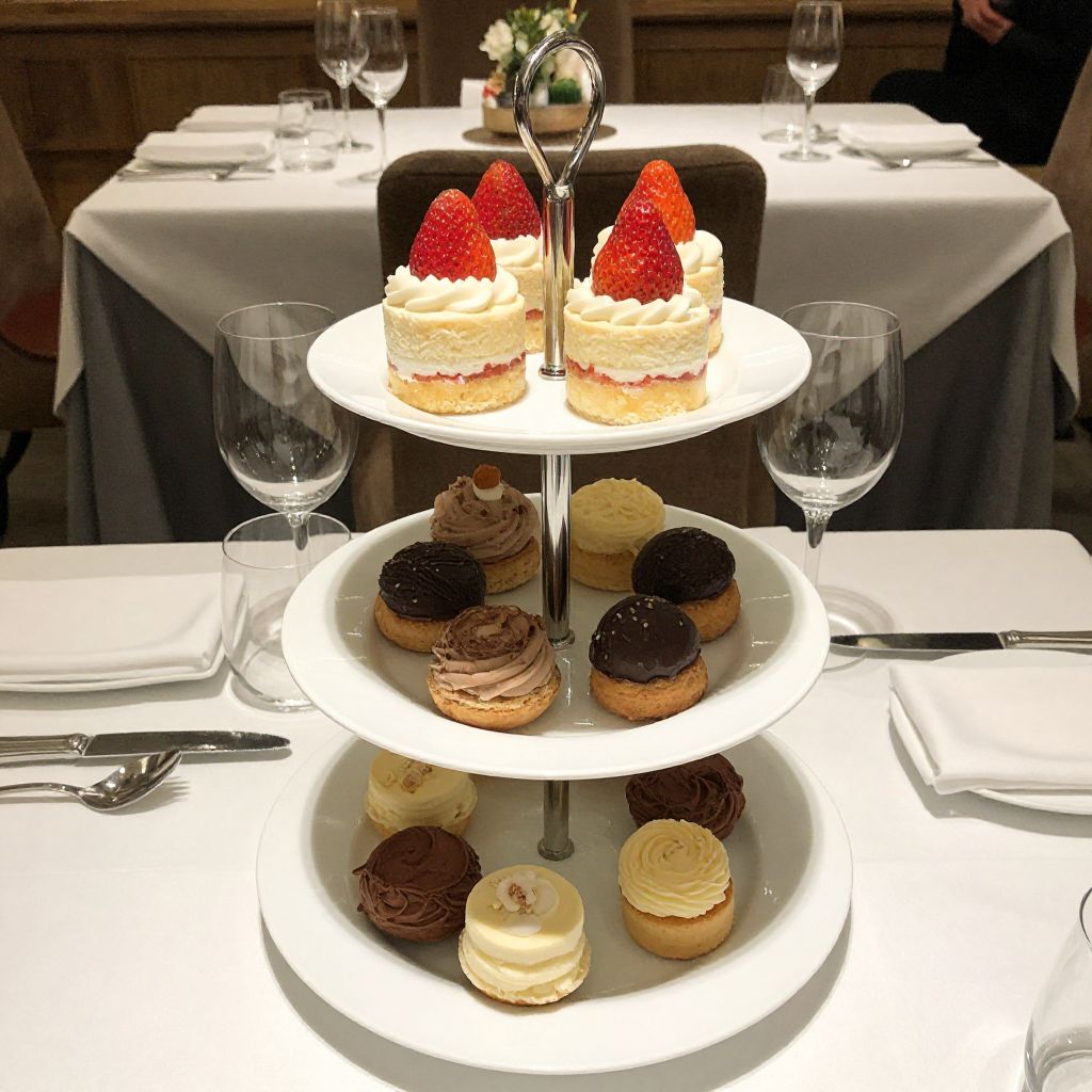 Tiered display featuring three levels of elegant desserts, including strawberry-topped cakes, chocolate-covered pastries, and sponge-like confections, set against a backdrop of a cozy dining area with wine glasses and utensils arranged neatly on a white tablecloth.