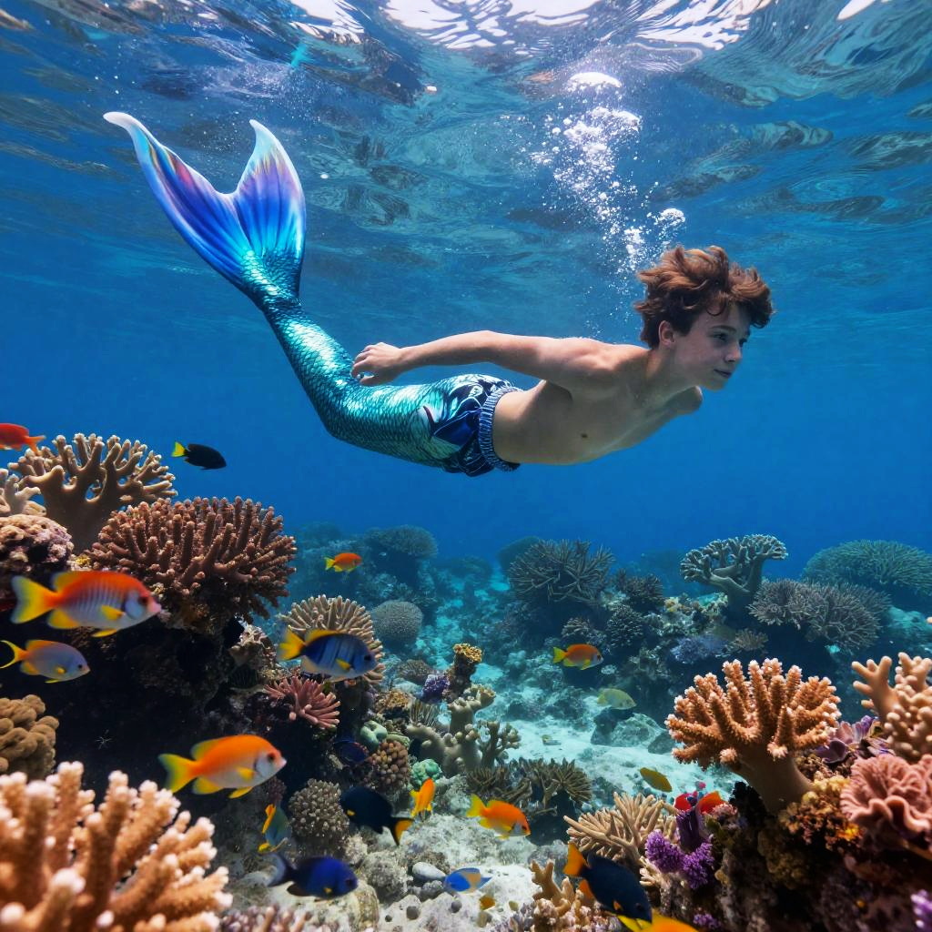 Photograph of a woman with long dark hair swimming underwater. She is wearing a green, shimmering mermaid-style tail, extending her arms forward. Sunlight filters through the clear blue water, illuminating her and the coral reef below. Her body is slightly tilted, creating a sense of motion.