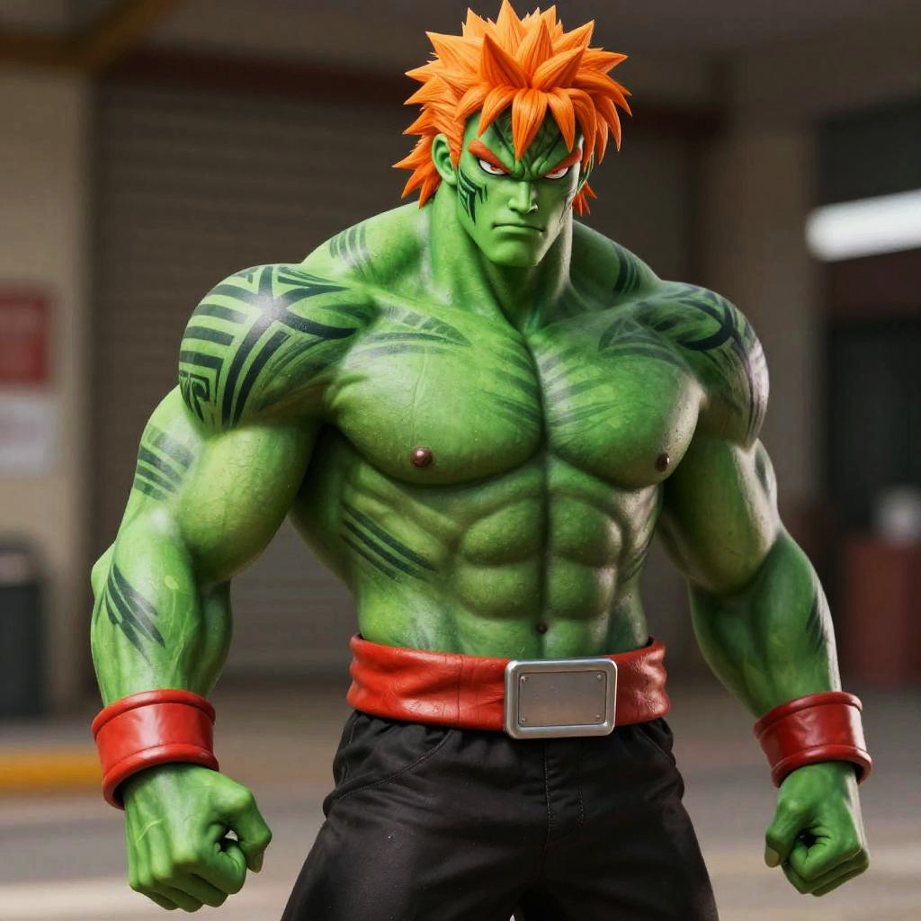 This is a CGI-rendered image of a muscular, green-skinned, anime-style character with spiky orange hair and intense red eyes. His physique is extremely muscular, with defined abs and large biceps, adorned with black tribal tattoos on his shoulders. He wears black pants with a red belt and red wristbands. His expression is fierce, with clenched fists at his sides. The background is a blurred, industrial setting with a dark, metallic door and some indistinct objects. The lighting emphasizes the character's muscular definition and green skin, creating a dramatic effect.
