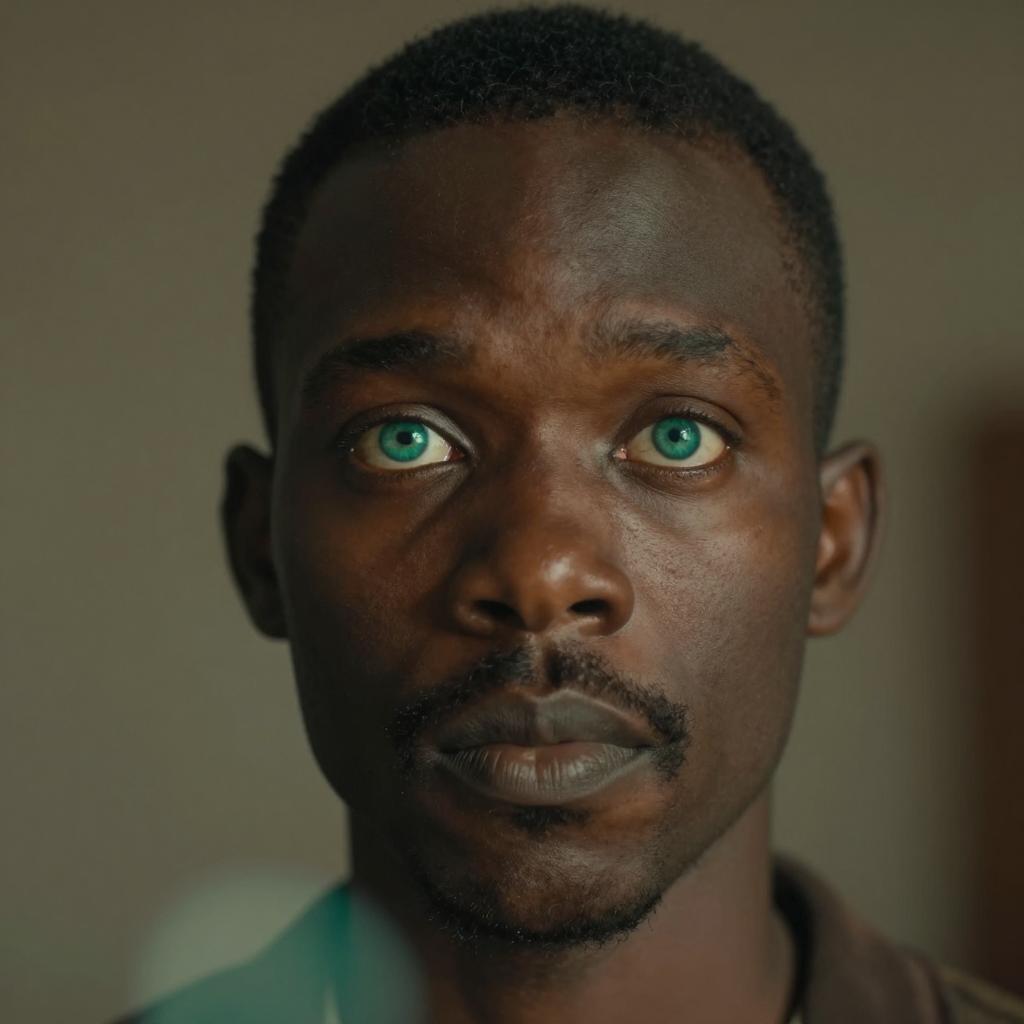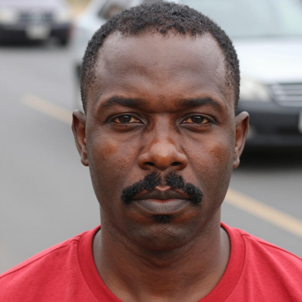 A middle-aged Black man with dark brown skin, short curly black hair, and a goatee. He has closed eyes and a slightly grimacing expression. He is sweating and wearing a beige shirt with a dark collar. The background is a bright red brick wall. He is centered in the frame.