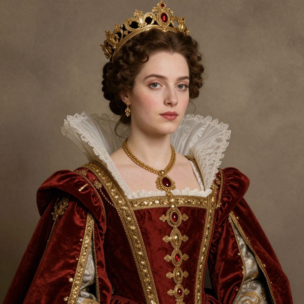 An aristocratic woman adorned in opulent Renaissance-inspired attire, featuring intricate gold embellishments and a deep red cloak, exudes regal elegance against a softly textured background, rendered in a high-definition digital art style reminiscent of Vilenchik's detailed and luxurious aesthetic.