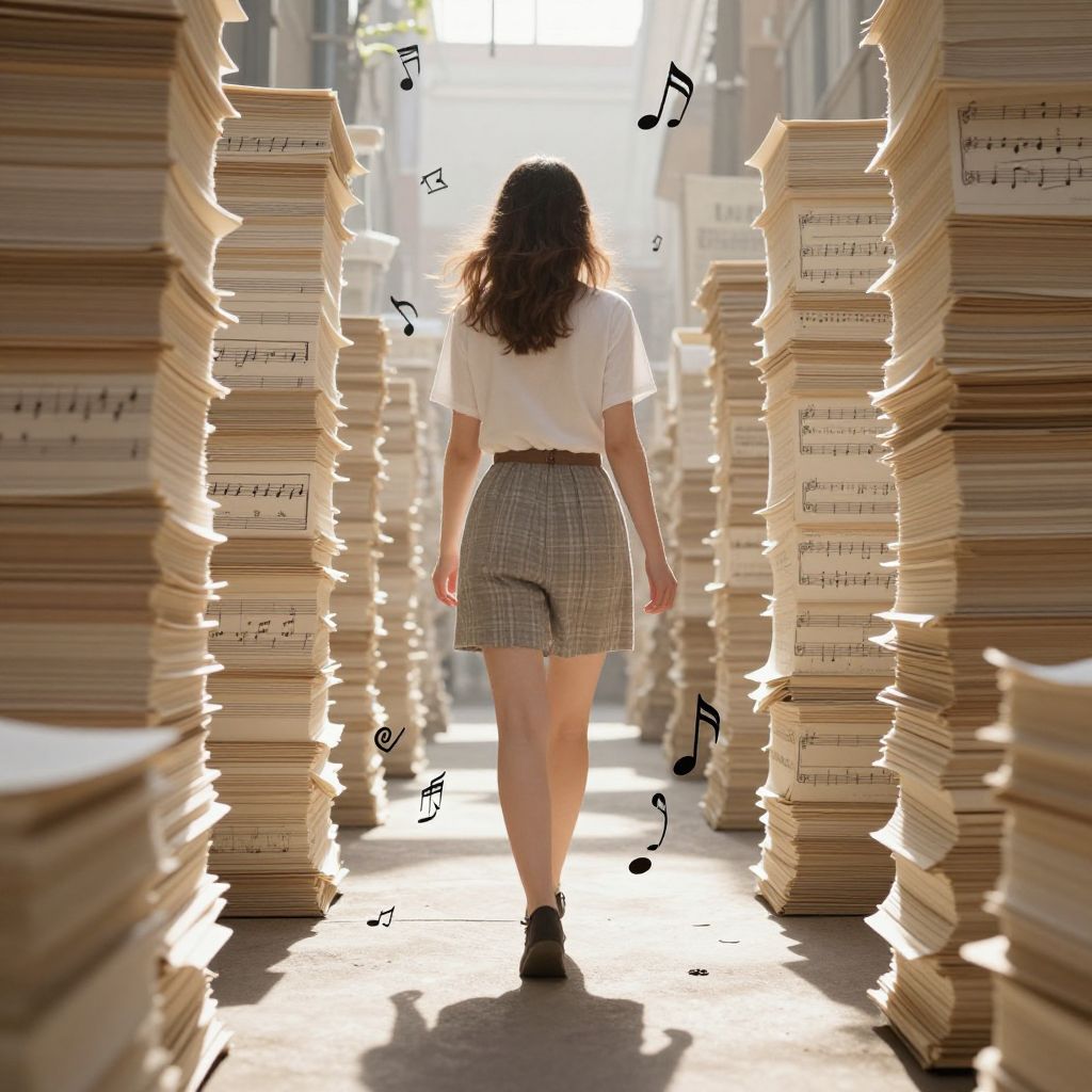 A woman walks through a surreal alleyway lined with towering stacks of sheet music, her footsteps stirring scattered notes beneath her as sunlight filters through the symphonic landscape.