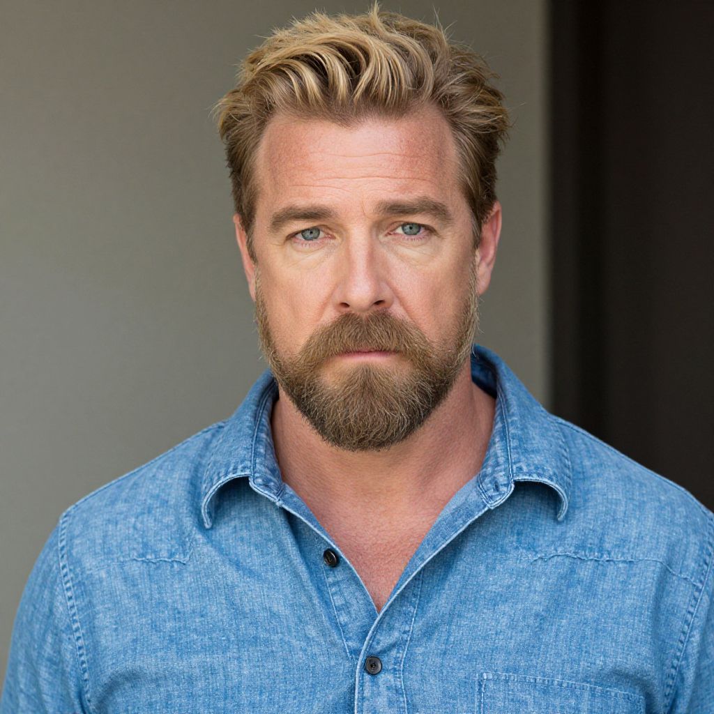 "guy fieri goatee costume, 1boy, male focus, solo, beard, facial hair, mustache, upper body, realistic, shirt, blonde hair Realistic photo of casual sexy person with pretty face"