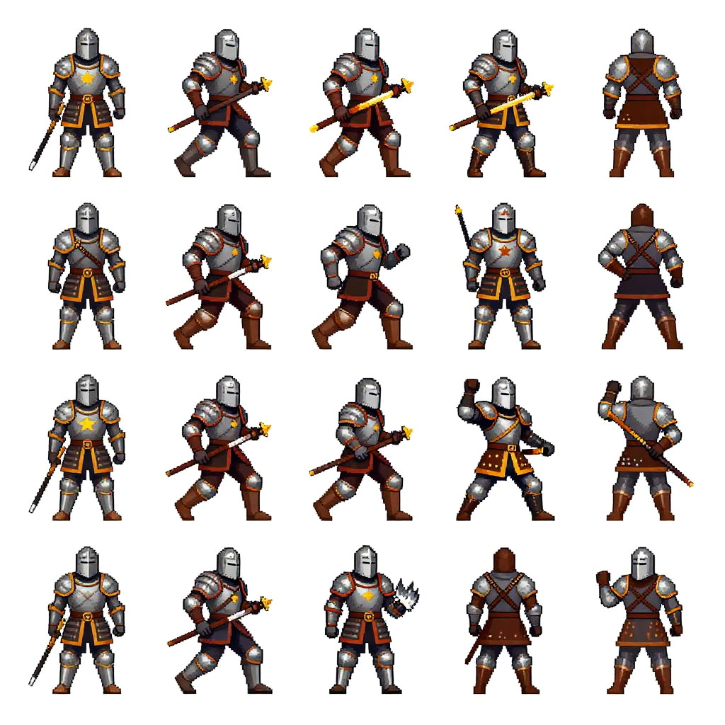 Pixel art walking animation of a brave knight in shining armor, detailed sprites, vibrant colors, retro video game style, smooth frame transitions, fantasy theme, 8-bit aesthetic