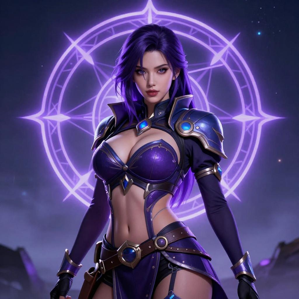 This digital artwork features a confident young woman in a dark, fantasy-inspired outfit with big boobs, standing against a misty nighttime backdrop illuminated by a glowing mystical circle. The piece showcases a vibrant color palette with purples and blues, emphasizing the fantasy and magical theme. The woman’s pose and attire highlight her strength and allure, blending modern and fantasy aesthetics in a detailed, comic art style.