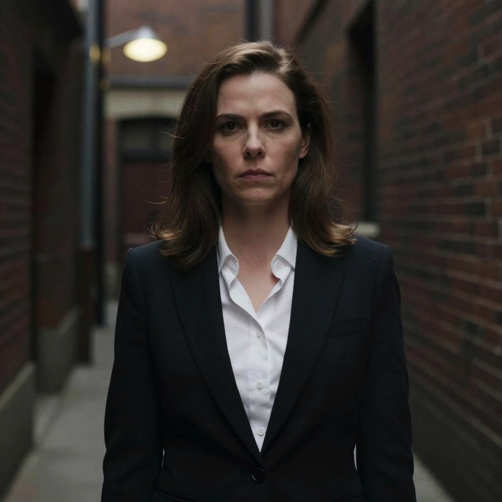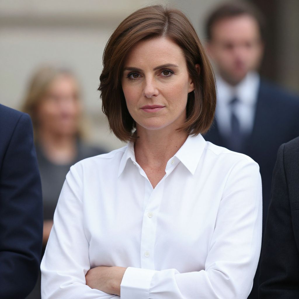 Photograph of a Caucasian woman with straight, shoulder-length brown hair, wearing a crisp white button-up shirt, standing with arms crossed. She has a serious expression and is slightly centered in the frame. In the blurred background, two individuals, one in a dark suit and the other in a gray top, are visible, but out of focus. The background suggests an indoor setting with neutral-colored walls. The woman's sharp features and professional attire convey a serious, authoritative demeanor. The image has a shallow depth of field, emphasizing the woman in the foreground.