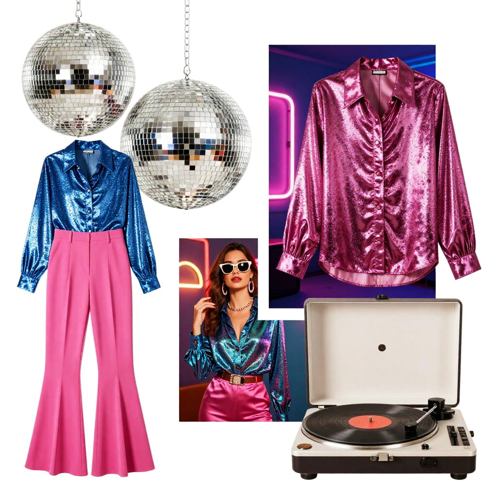 Stylish moodboard collage with a retro disco 70s, featuring bell-bottom pants and shiny polyester shirts. The background includes disco balls, neon lights, and record players to add a natural touch. The color palette is bold and colorful, with a high-fashion editorial style. Layered images create a cohesive and visually captivating moodboard, blending vibrant colors with carefully curated fashion elements for an inspiring, trend-focused design.