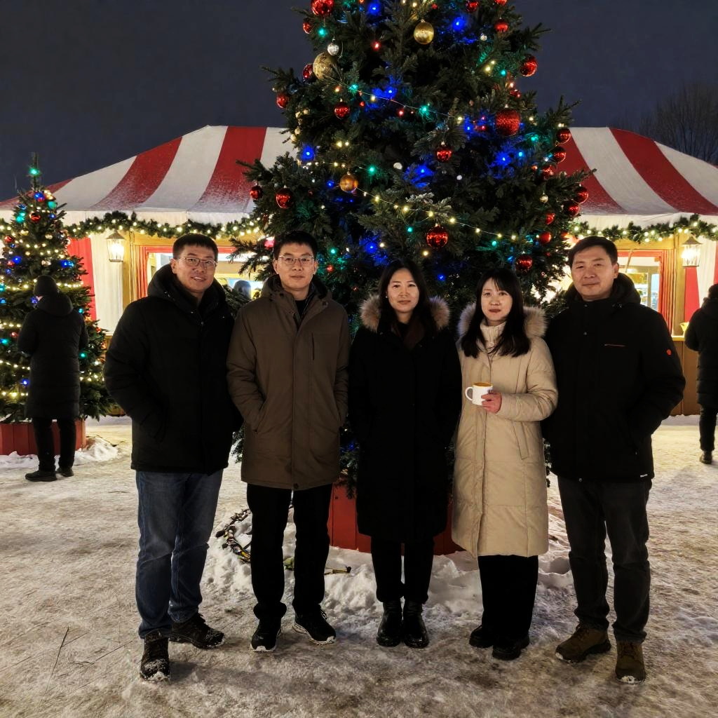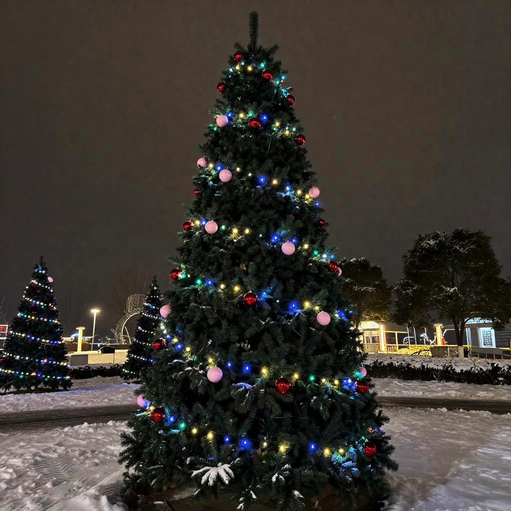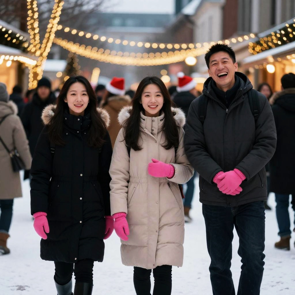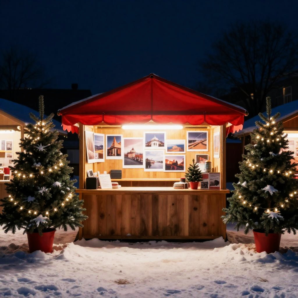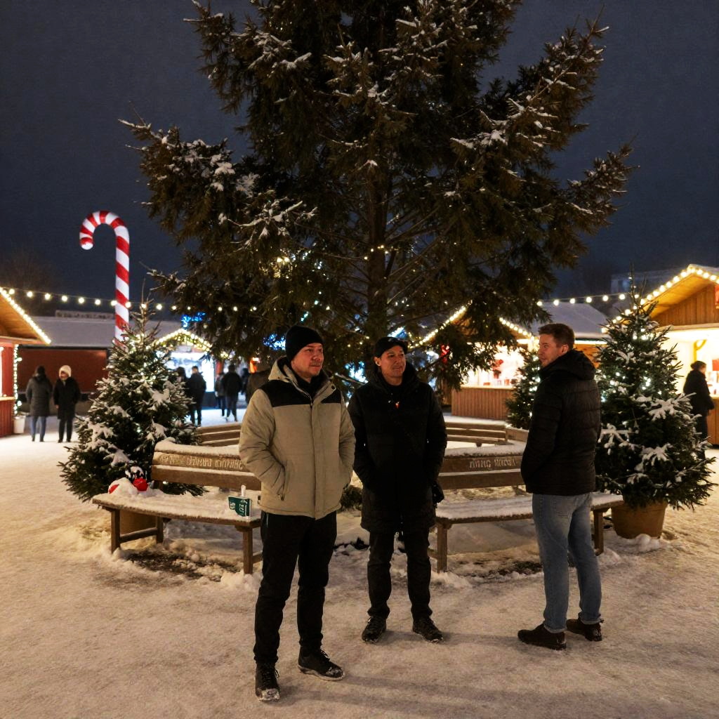 Nighttime photograph of a festive outdoor market. People in winter clothes stand on a brightly lit wooden bridge with red-and-white striped canopy. Christmas lights, decorated trees, and boats in the background. Three people visible, one with a brown coat, another with long brown hair, and a third in the background. Lanterns and string lights illuminate the scene.