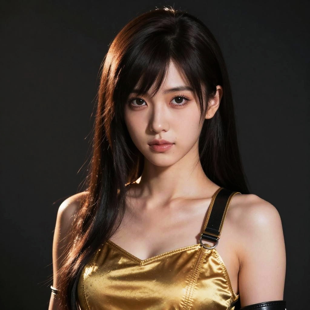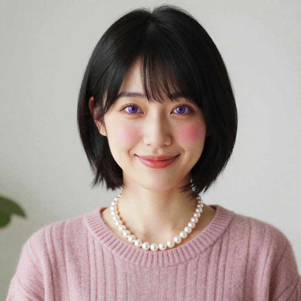 Photograph of an East Asian woman with long black hair and blue eyes, smiling softly. She wears a white long-sleeve shirt and blue jeans. The foreground shows a close-up of her face, highlighting her smooth, fair skin and bangs. In the background, she stands confidently in a sunlit field of colorful flowers, with her hand on her hip. The image uses a digital medium with vibrant colors and sharp focus, emphasizing her natural beauty and relaxed, cheerful demeanor.