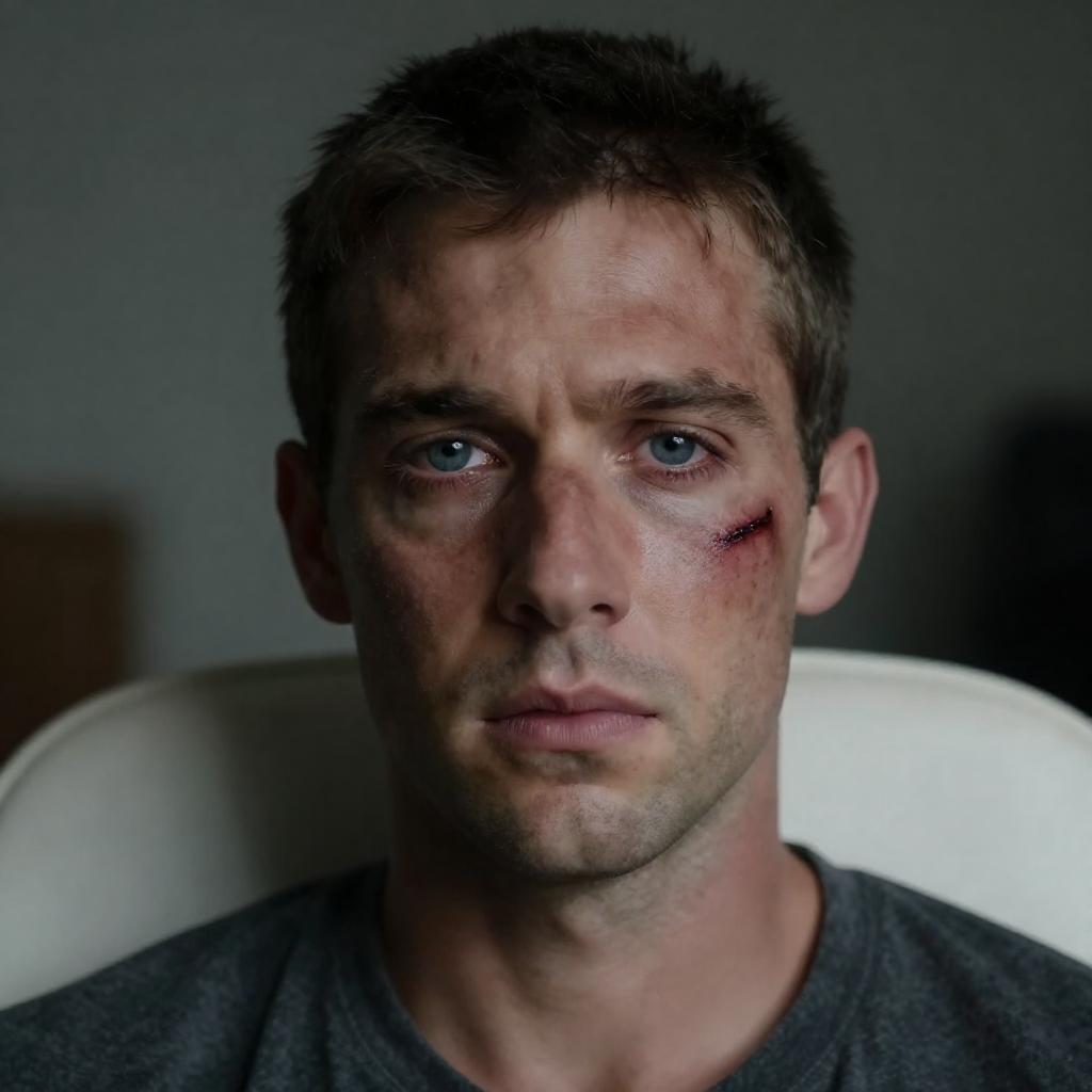 Photograph of a man with short dark hair, open mouth in pain, large red sore on cheek. Two bloody, brown hands gripping his face from the right. Green grassy background with trees in sunlight. Man wears green shirt.
