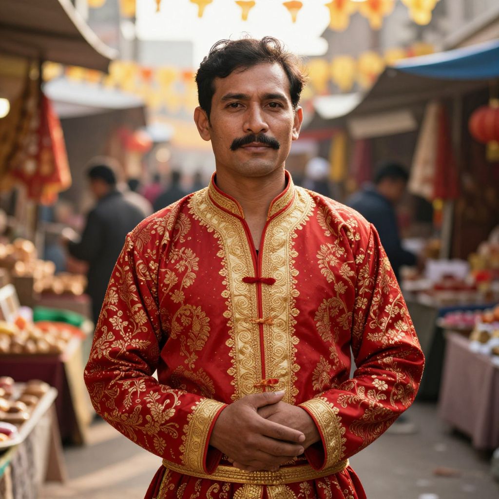 A man with dark hair and a mustache, possessing a strong, confident demeanor, is wearing a traditional red and gold motif outfit that symbolizes cultural heritage and festive spirit. He is standing in a vibrant, bustling market setting filled with colorful stalls and the vibrant energy of a festive celebration. The scene is illuminated by warm, golden sunlight that casts a radiant glow across the surroundings, enhancing the festive atmosphere. The man's calm and proud expression reflects the deep pride of his cultural roots, with a sense of dignity and authenticity in every gesture.