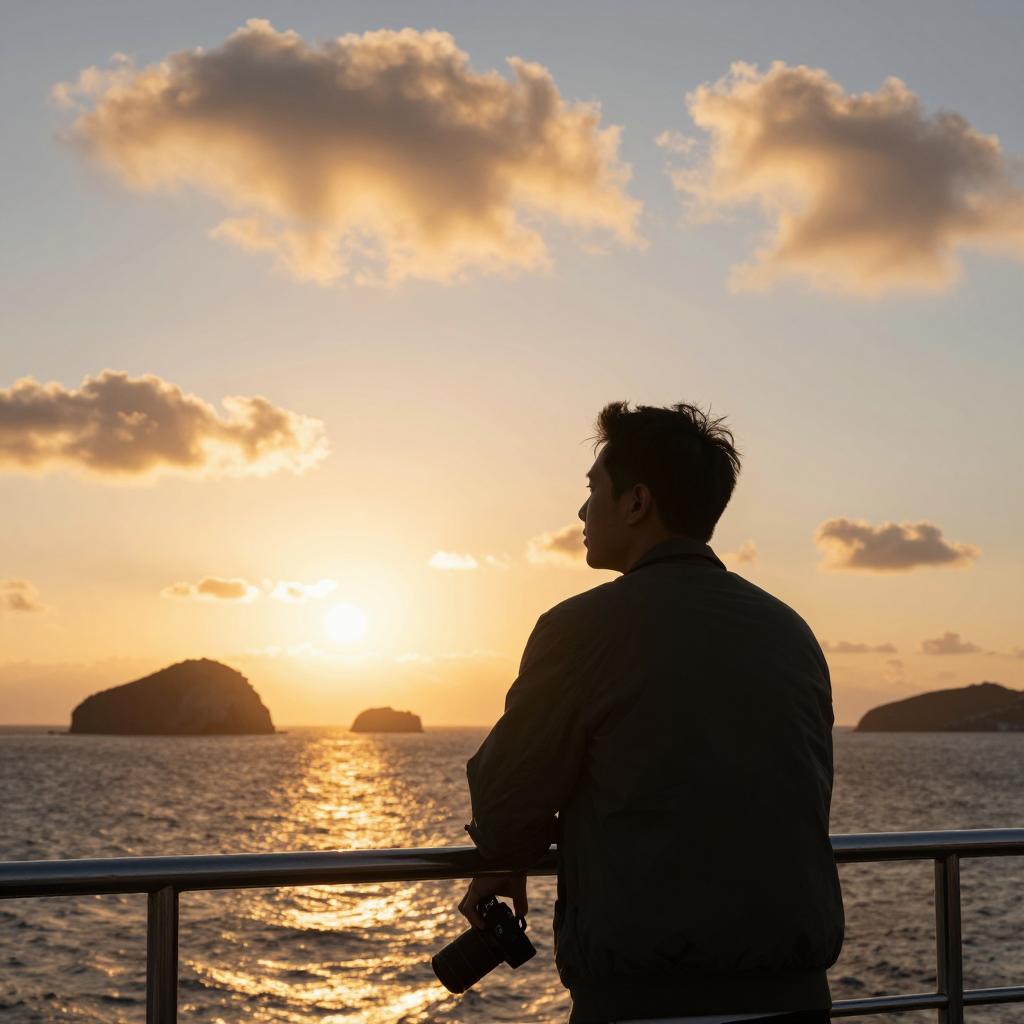Silhouetted man with short hair, wearing a dark jacket, leans against a railing on a boat. Bright yellow-orange sky with glowing clouds and a reflective water surface. Rocky islands in the background. Man holds a camera in his right hand. Single person. Intense sunset light.