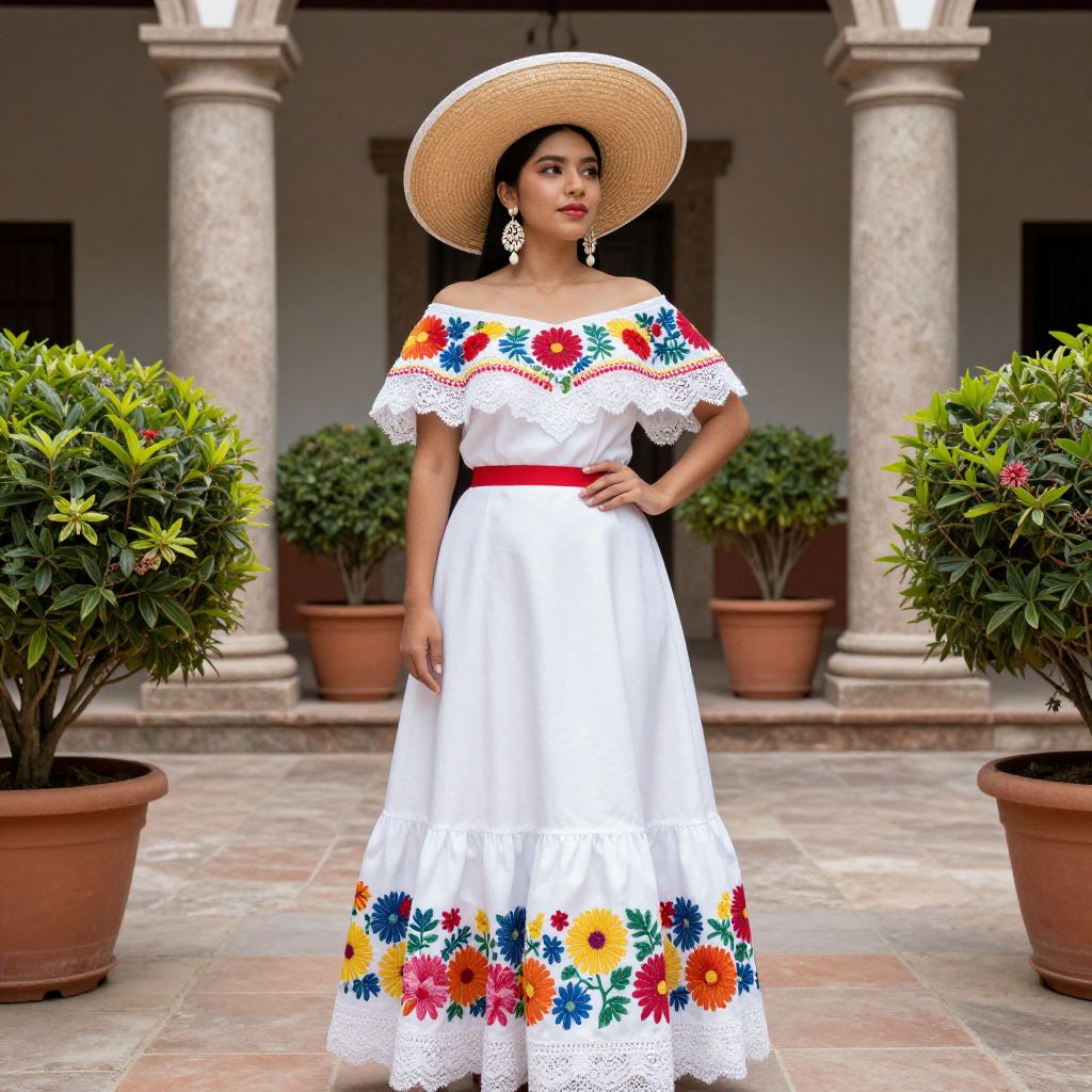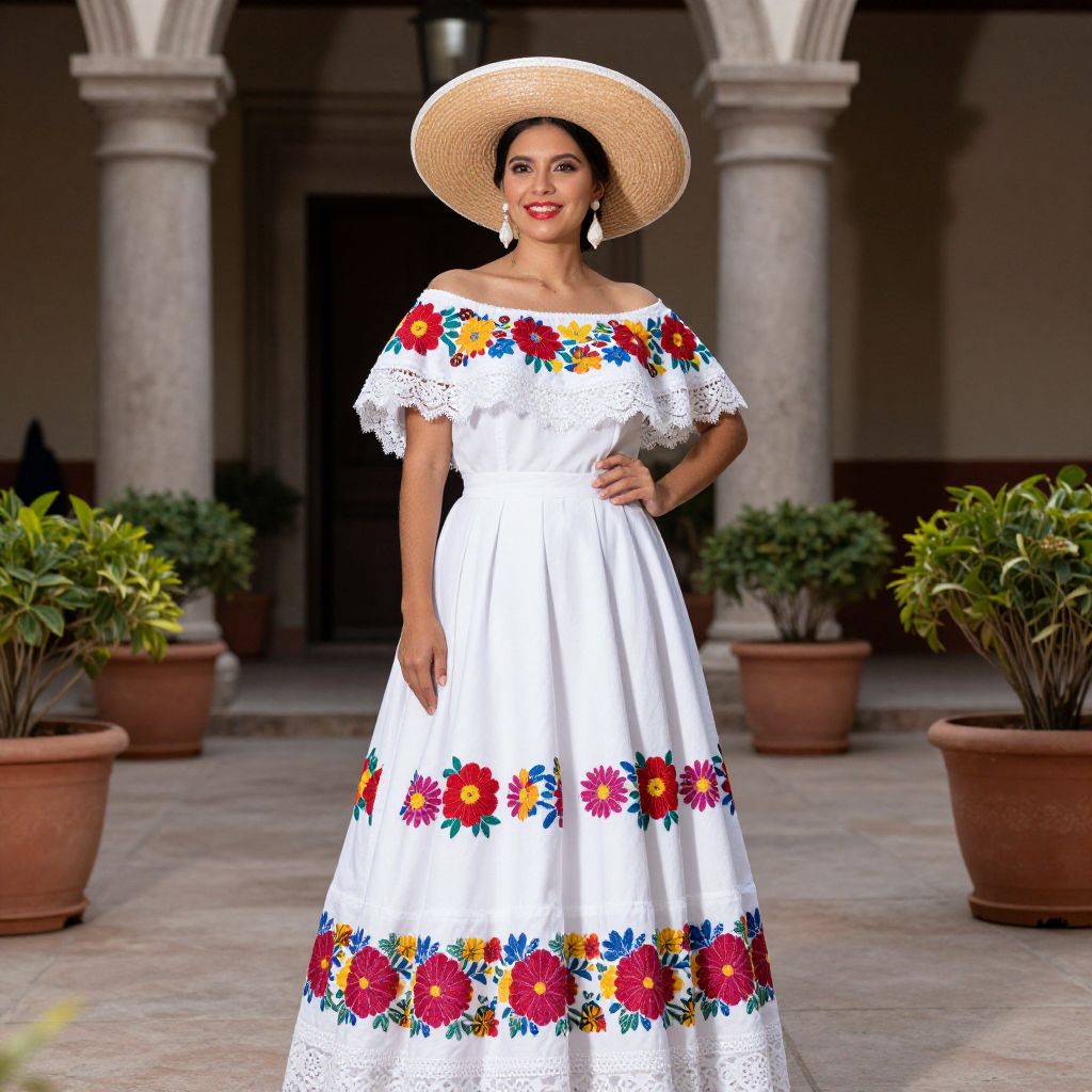 Woman wearing a vibrant Mexican-themed wedding dress with floral embroidery, off-the-shoulder lace sleeves, and a wide-brimmed straw hat, standing outdoors in a courtyard surrounded by potted plants and architectural columns.