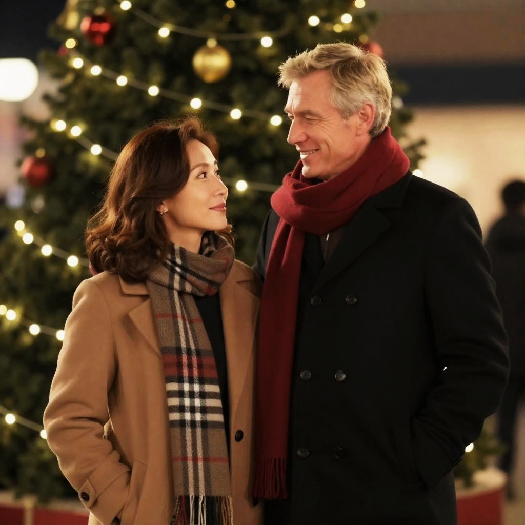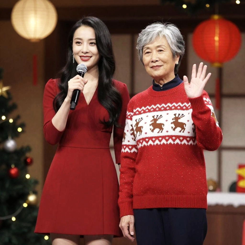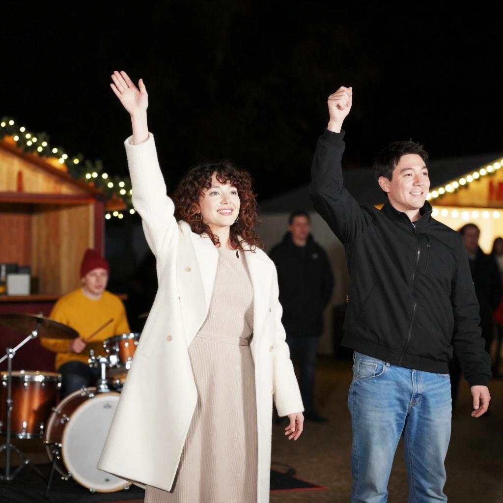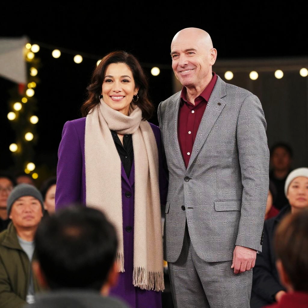 Photograph of two smiling people on stage at night. Woman with dark brown hair, purple coat, beige scarf. Bald man with gray plaid suit, red shirt. Background with string lights, festive decorations. Audience members in foreground, some wearing hats.