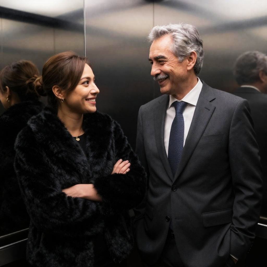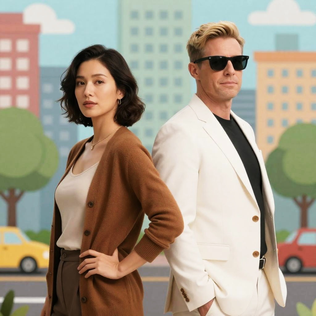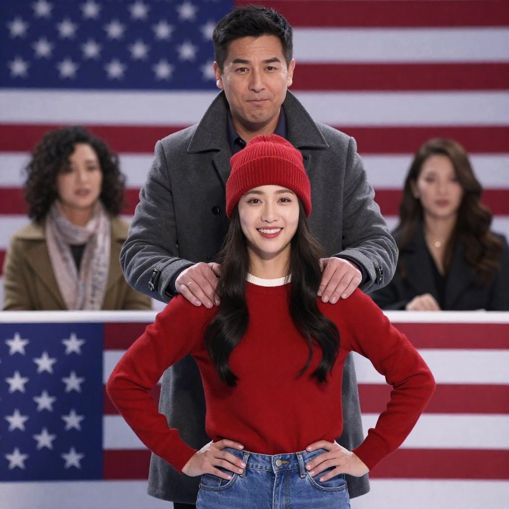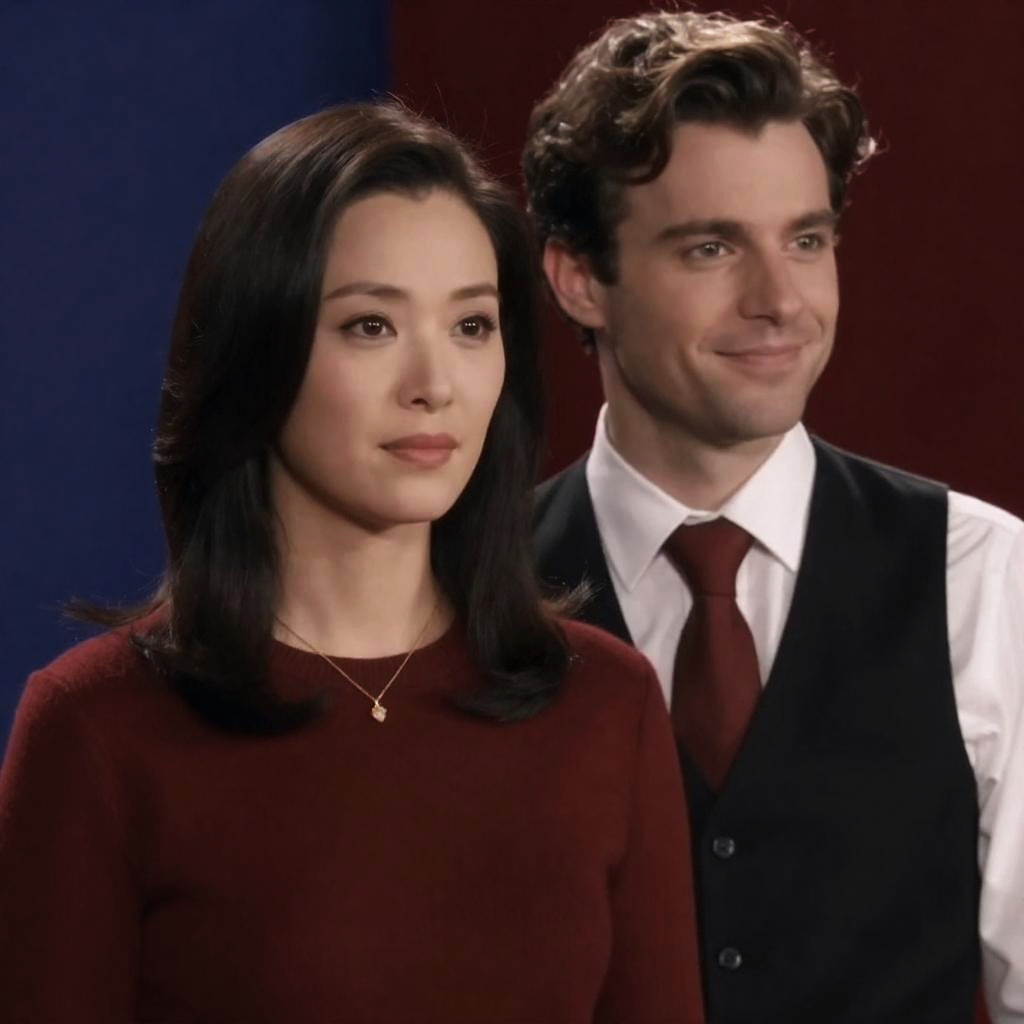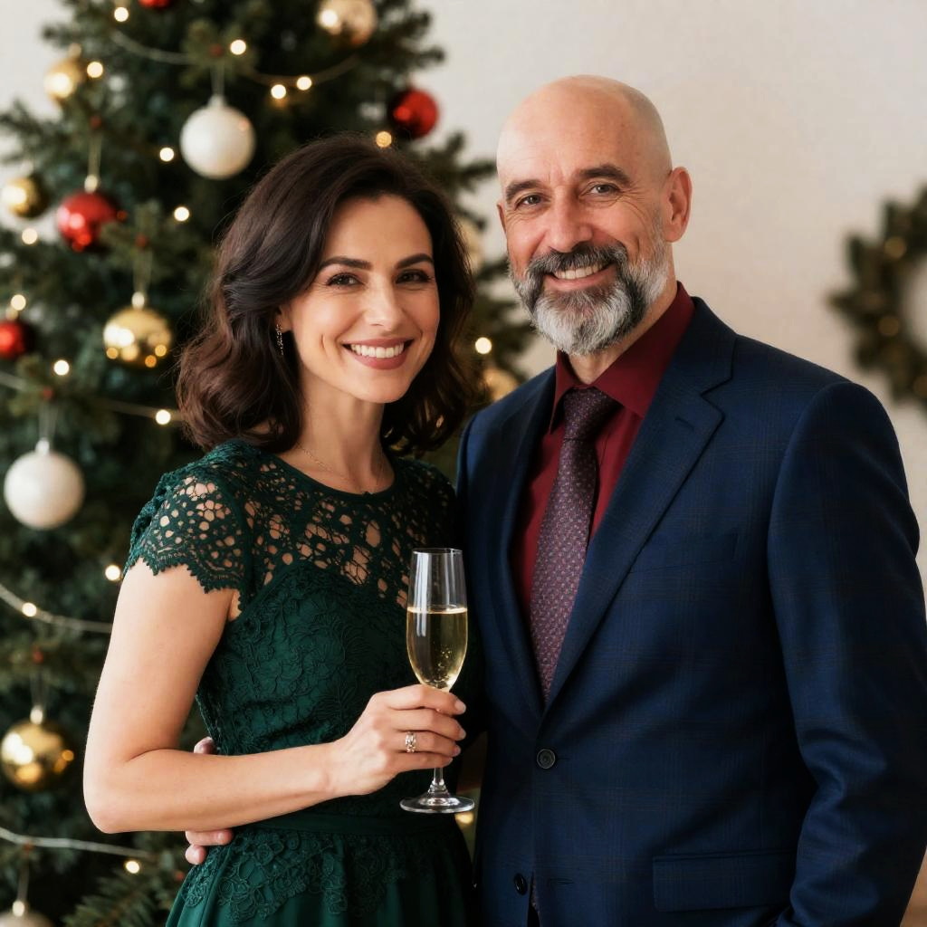 Photograph of two smiling people on stage at night. Woman with dark brown hair, purple coat, beige scarf. Bald man with gray plaid suit, red shirt. Background with string lights, festive decorations. Audience members in foreground, some wearing hats.