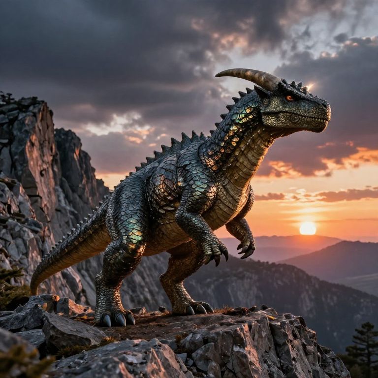 Photorealistic CGI image of a large, dark green, scaly dragon with sharp horns and spikes standing on a rocky mountain peak at sunset. The dragon's textured skin glistens in the fading light. The background features dramatic, jagged mountain cliffs and a vibrant sky with orange, pink, and purple clouds. The dragon's muscular physique and powerful stance suggest strength and dominance. The rocks beneath it are detailed with shadows and textures, enhancing the realism. The overall scene combines elements of fantasy and nature, creating a striking and immersive visual.