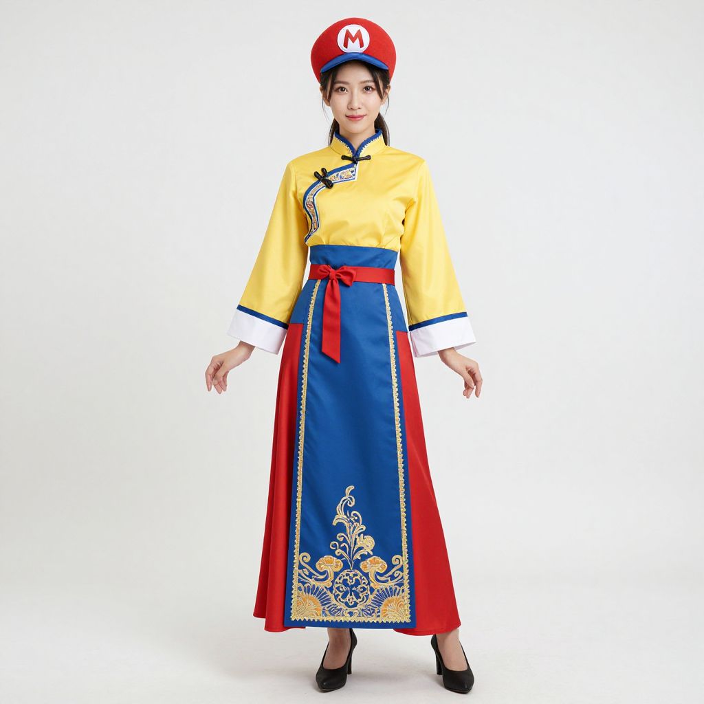 Photograph of an Asian woman standing against a plain white background. She is wearing a traditional Chinese outfit with a yellow long-sleeve top, blue and red apron, and a red skirt with intricate yellow embroidery at the hem. The outfit is accented with blue and white trim. She has a red hat with a white "M" logo, similar to Mario's hat. She has fair skin, black hair in a simple style, and is wearing black high-heeled shoes. Her expression is neutral, and she stands with her arms slightly away from her body.