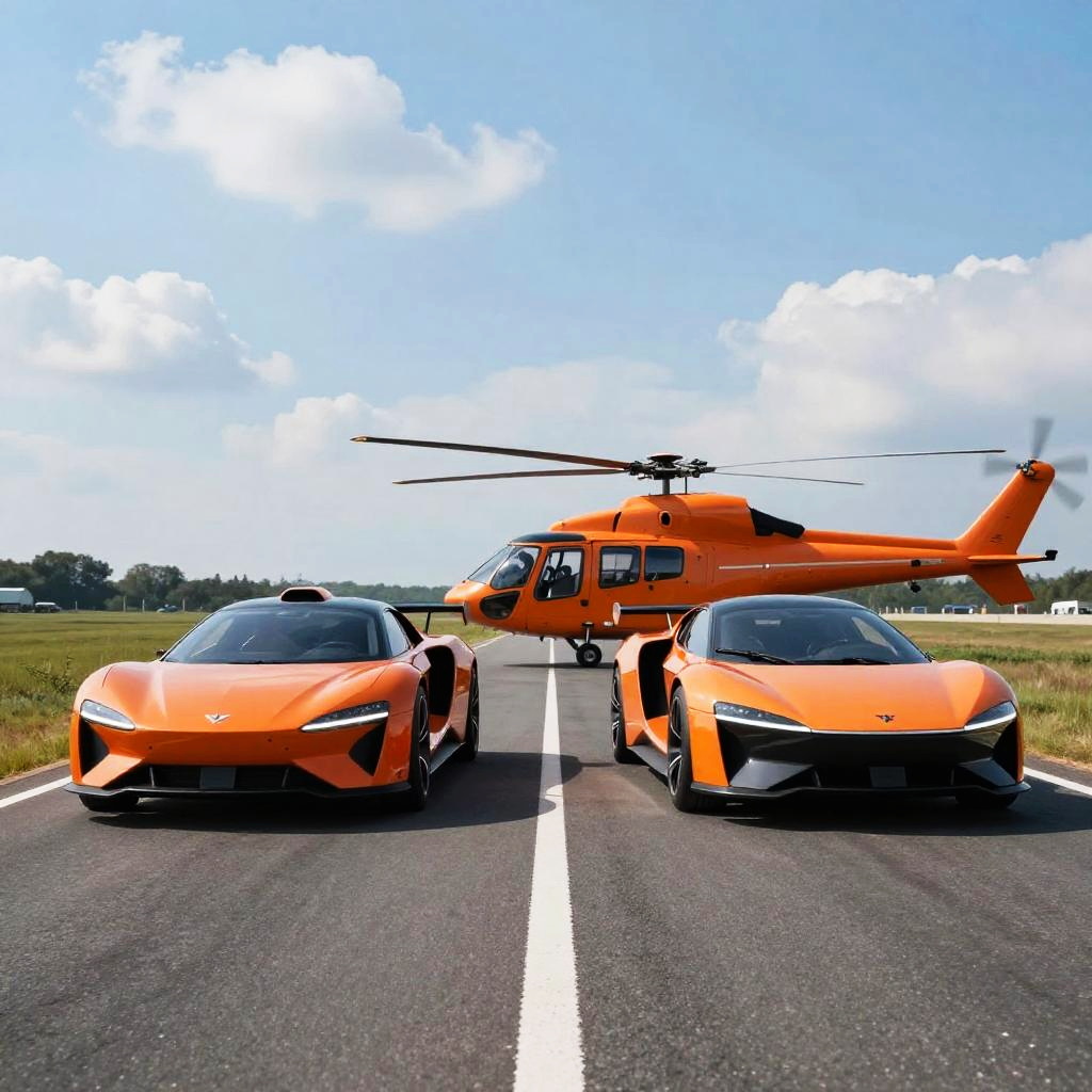Photograph of two futuristic, orange and black hover cars parked on a straight, asphalt road with a white center line. Each car has sleek, aerodynamic designs and large wheels. A helicopter with a similar color scheme is positioned behind the cars, slightly to the right. The background features a grassy field and a clear, blue sky with scattered clouds.