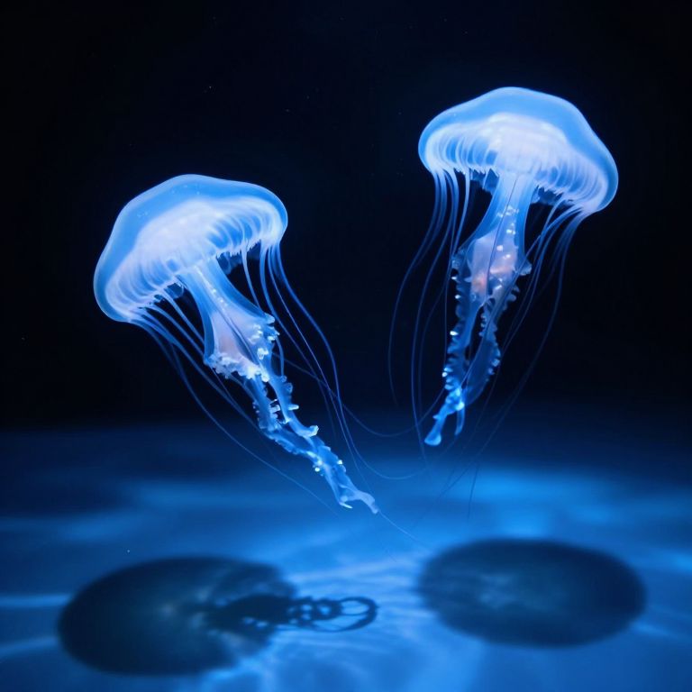 Two ethereal jellyfish with translucent, crystalline bodies and glowing blue tentacles float gracefully above a reflective surface, their luminous forms casting intricate shadows and creating a mesmerizing interplay of light and shadow against the dark, aquatic backdrop.