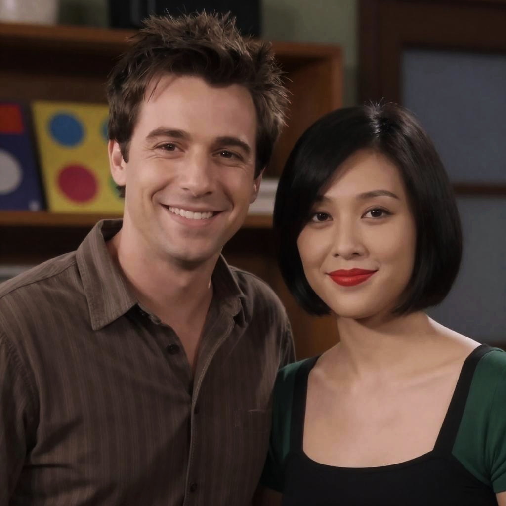 A photograph of a man and woman standing close together against a dark background with blurred lights. The man has short brown hair, a mustache, and is wearing a tan blazer over a brown button-up shirt. The woman has short dark brown hair and is wearing a white V-neck blouse. Both have neutral facial expressions and are positioned with the man on the left and the woman on the right.