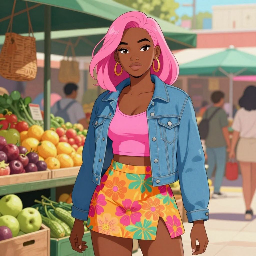 Vibrant digital illustration of a confident woman with pink hair wearing a green crop top and denim shorts, standing in front of colorful lowrider cars on a city street during sunset. The urban backdrop features tall buildings, palm trees, and a crowd of people, evoking a lively, tropical city atmosphere.