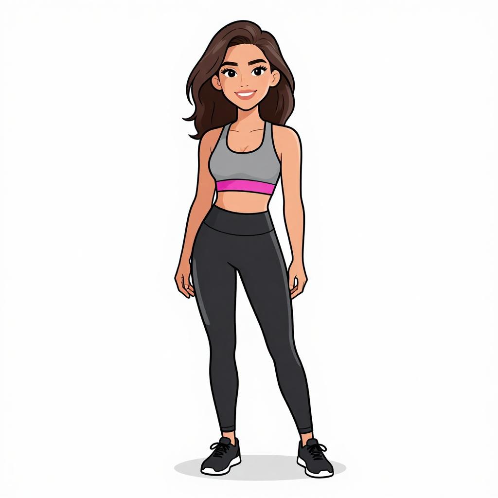 Woman with pretty face and pretty hair. smiling Woman, athleisure, fitted crop top in heather grey with pink elastic band, scoop neck, racerback, black leggings with reflective accents, ankle-length, black minimalist sneakers with a low profile. --sref 1467