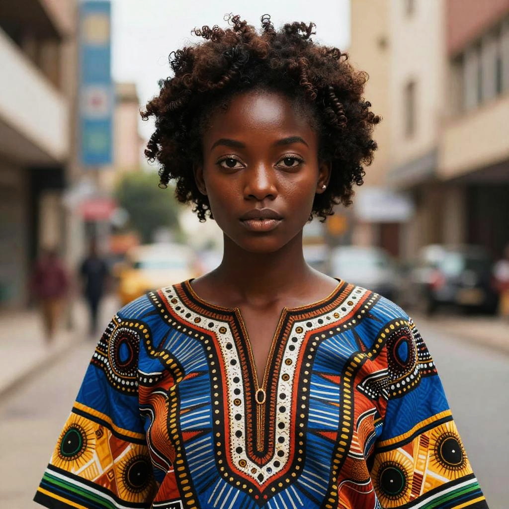 Afroasian young woman in traditional attire blending African and Asian cultural elements, vibrant colors, intricate patterns, urban background with surreal lighting, soft focus, high detail, digital art style
