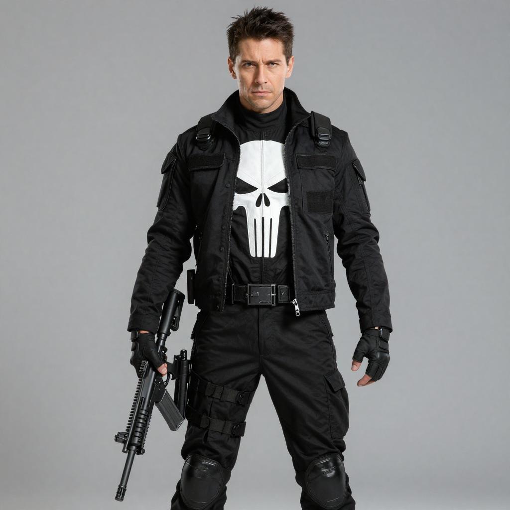 A man dressed in a realistic The Punisher cosplay costume. He wears a black tactical outfit featuring the iconic white skull emblem on the chest and belt. The costume includes tactical gloves, cargo pants, and a black jacket with utility pockets. He is holding a prop assault rifle, embodying the comic book antihero look.