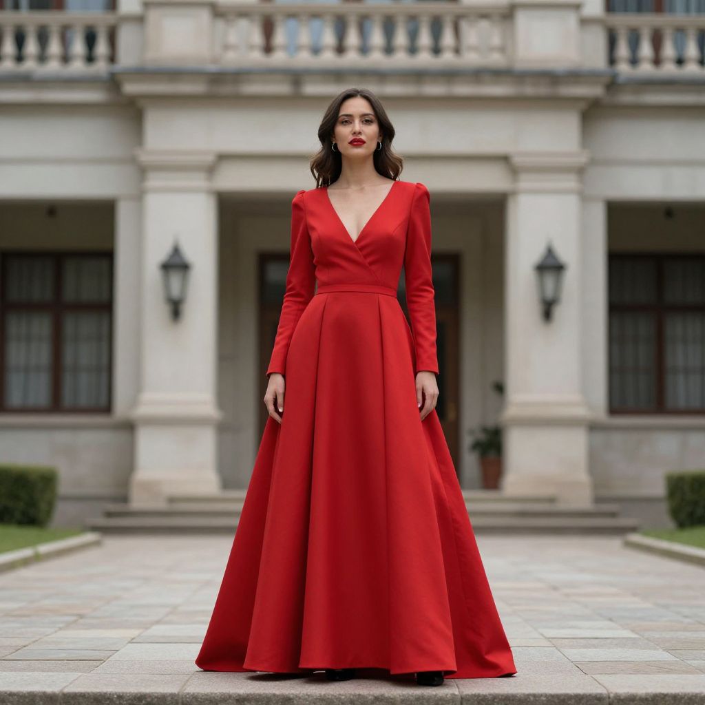 Photograph of a young woman with fair skin and dark wavy hair standing confidently in front of a grand, classical-style building. She wears a striking, long-sleeved, deep red evening gown with a V-neckline and a full, flowing skirt. The gown's fabric is smooth and slightly glossy. Her red lipstick matches the dress, adding to her elegant appearance. The background features a white stone building with tall windows, black lanterns, and a balustrade. The ground is paved with large, light-colored tiles, and there are small bushes on either side. The image has a slightly blurred, soft-focus effect, emphasizing the subject.