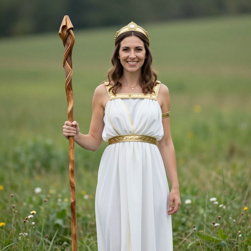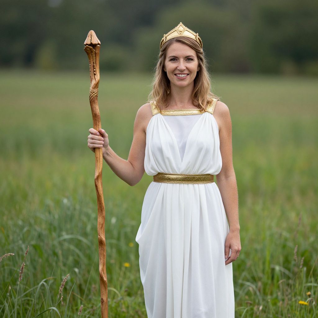 Smiling woman dressed as Artemis stands outdoors in a lush green field, wearing a flowing white toga with gold accents, a golden crown atop her head, and holding a wooden staff, embodying the DIY Greek goddess costume.