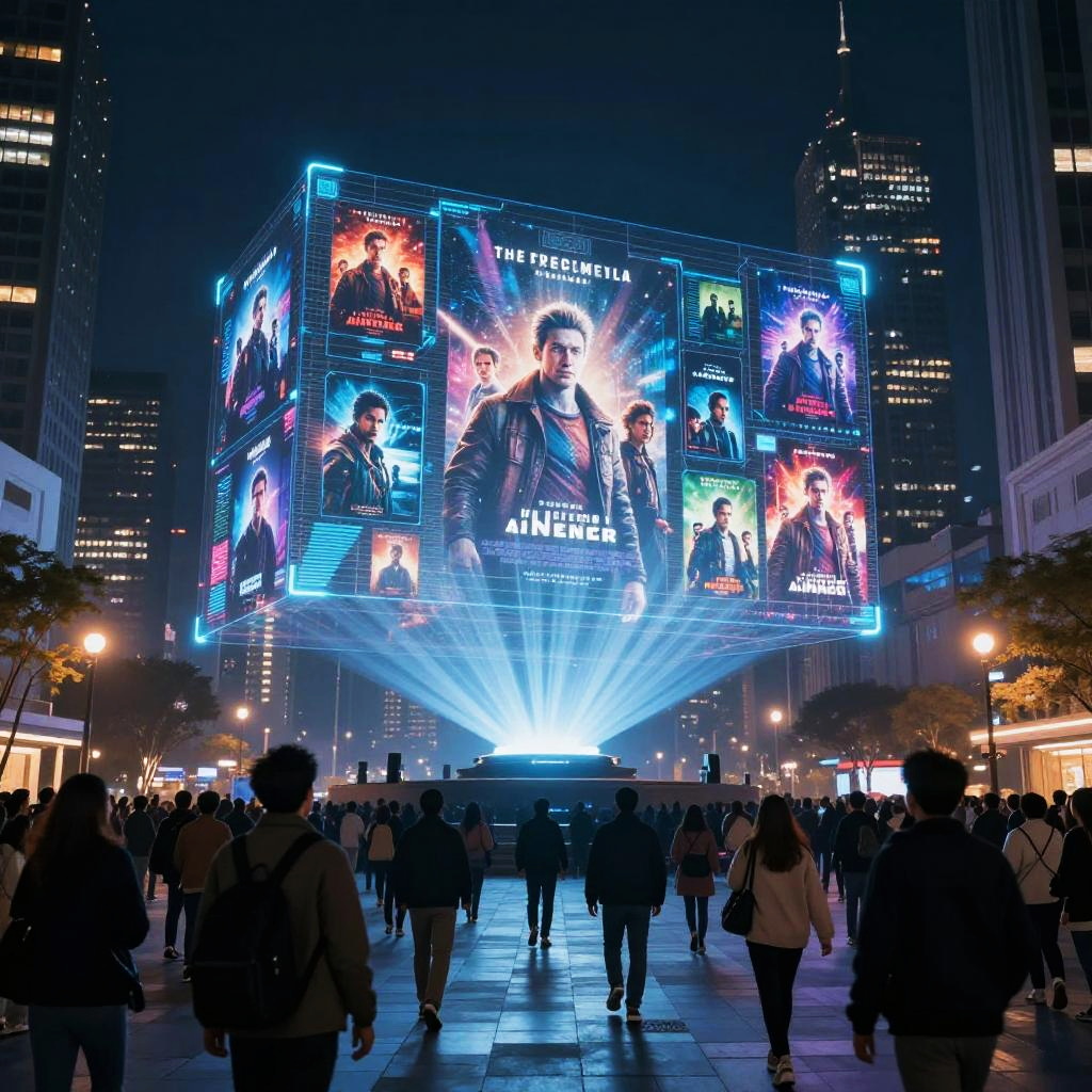 AI movie poster generator free, hyperrealistic illustration of a giant AI hologram projector casting movie images into a bustling city plaza at night, glowing lights, futuristic crowds watching, cinematic composition with vivid colors and deep shadows, sci-fi movie vibe