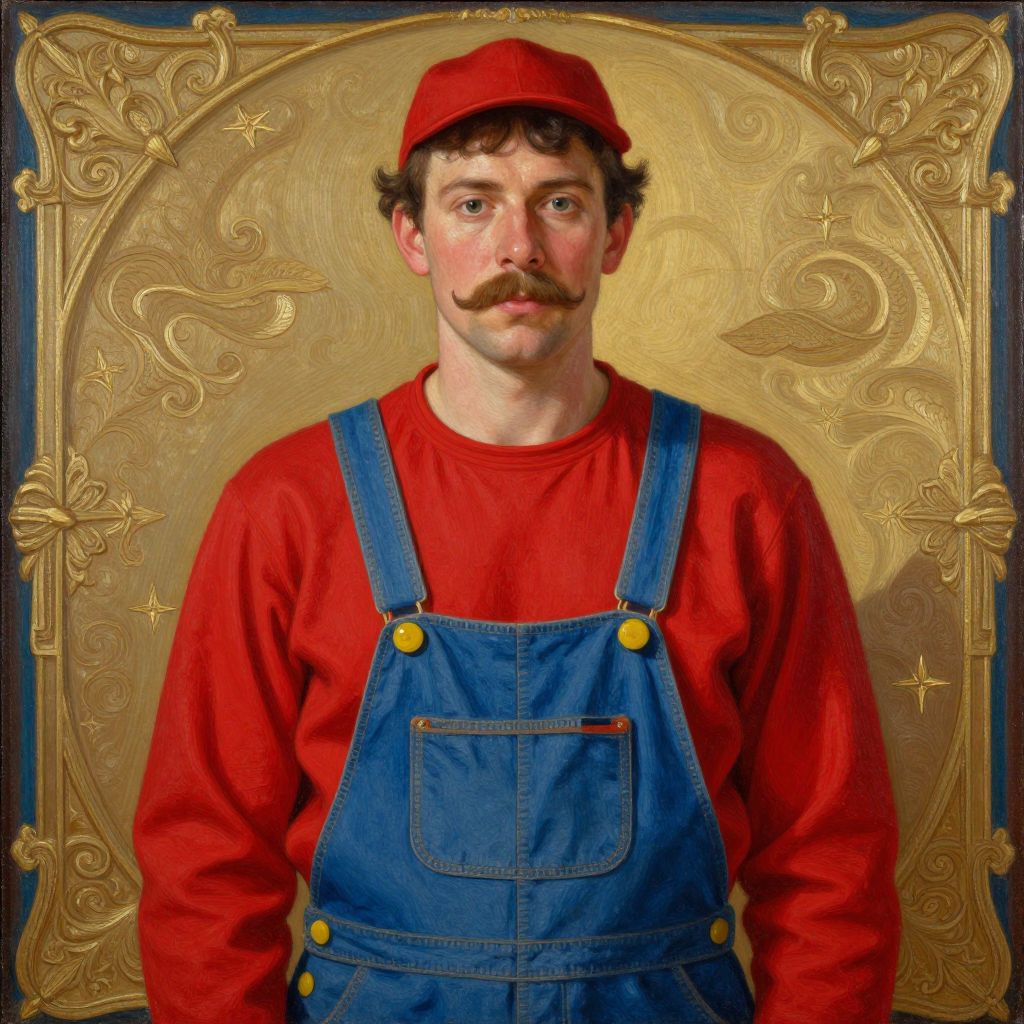 A portrait of a man with a mustache wearing a long - sleeved red shirt, a pair of blue overalls with yellow buttons, and a red cap, art by mark ryden, oil on canvas, ornate details,