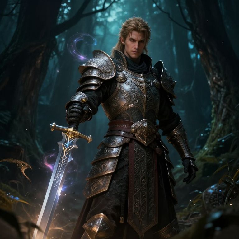 Digital fantasy artwork of a serious, armored man with blonde hair holding a glowing sword in a dark, misty forest.