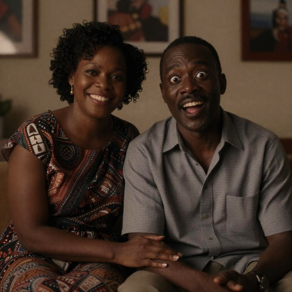 Photograph of a smiling African-American woman with dark skin and short, curly black hair wearing a patterned dress, seated next to a man with dark skin and short hair, wearing a checkered shirt. The man has exaggerated, glowing eyes and an open-mouthed smile. Warm, dimly lit indoor setting with framed pictures in the background. Woman's right hand rests on the man's lap.