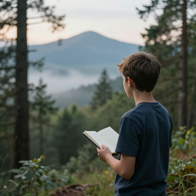 A prompt for single boy shows a quiet boy in a forest clearing, holding a small notebook, gazing at a distant mountain range, with mist rising around him, evoking a sense of introspection and stillness, cinematic, high detail, natural lighting.