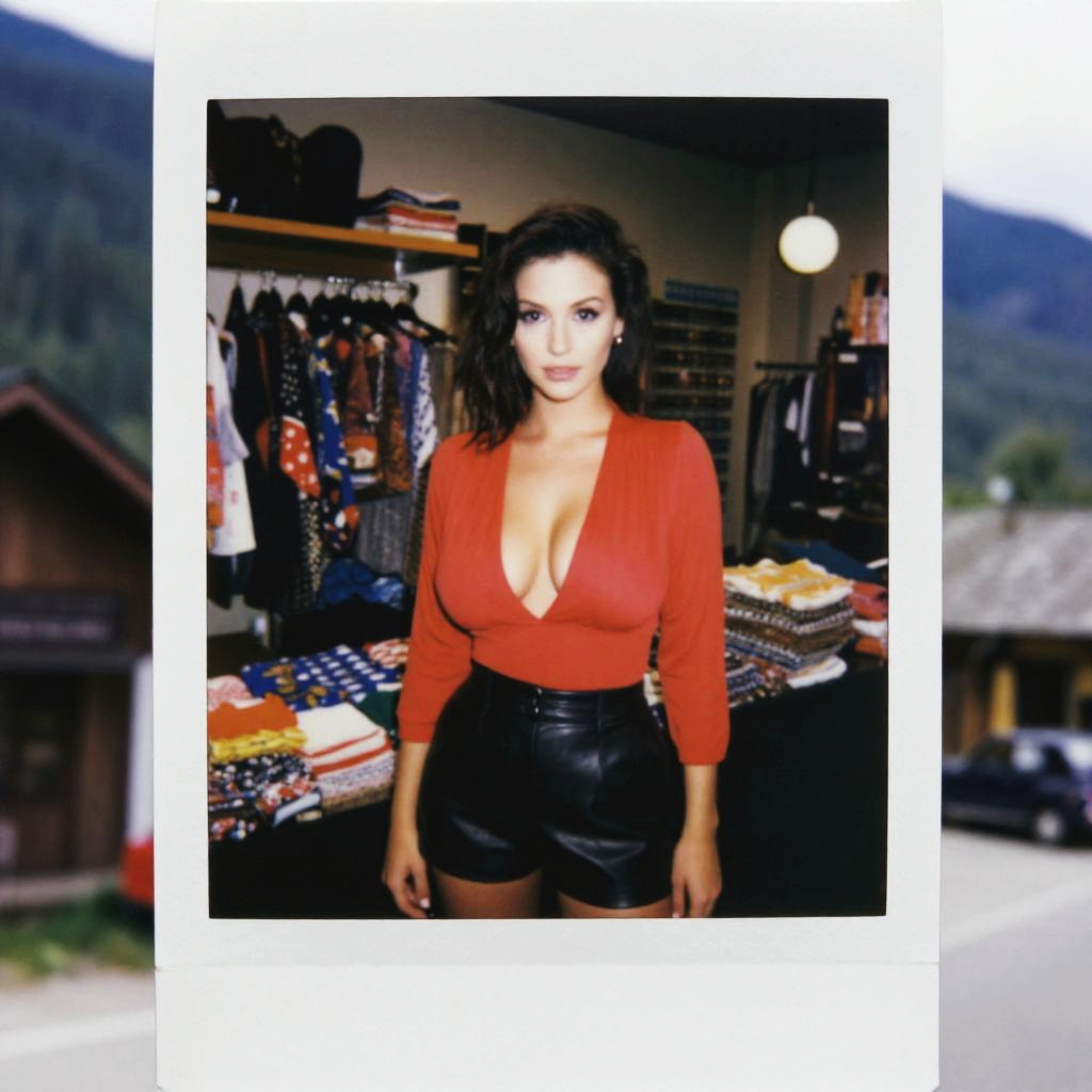 A woman in a vibrant red blouse with a deep V-neck and black leather shorts stands in a vintage boutique in a mountain town, captured in the style of a polaroid instant camera. Sexy. Pretty face and beаutiful eyes. Big breasts