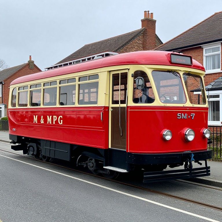 Preserved AEC Regal half-cab tram, marked as SM-7-11-465 CM and numbered 513B, stands stationary at Bylands Tramway Museum, showcasing its vibrant red and cream livery with \"M & MPG\" branding along its side, set against a backdrop of residential buildings and a quiet street.