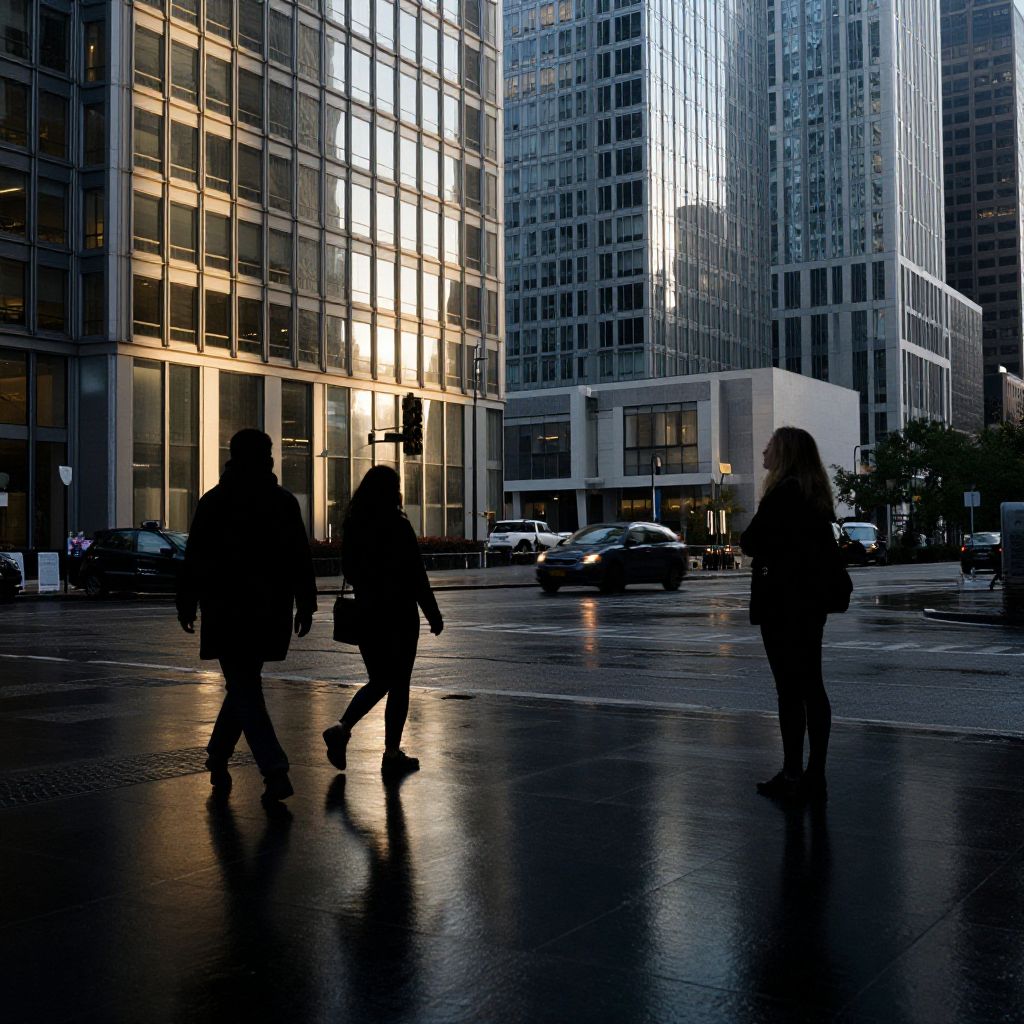 Urban reflections shimmer in a wet street as silhouetted figures walk between towering glass skyscrapers, their windows revealing glimpses of life within, while a lone woman stands contemplatively on the right, her shadow cast by the fading light.