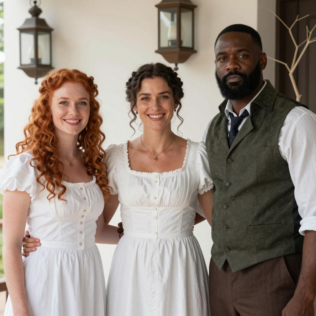 Three people posing in front of a 'Wanted' poster. The central man has tan skin, is wearing a brown hat, red scarf, white shirt, and brown jacket, smiling and holding a gun. To his left is a blonde woman with long hair wearing an off-shoulder black top and denim jeans. To his right is a man with dark skin wearing a black hat and dark shirt, smiling with his arm around the central man. Background includes a wooden door frame.