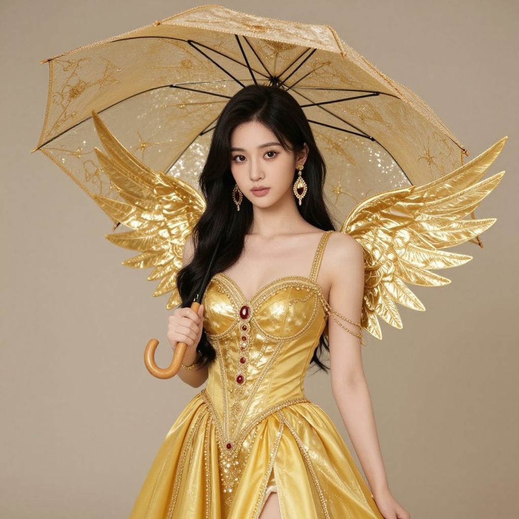 Gold angel fancy dress, 1girl, solo, dress, long hair, realistic, umbrella, earrings, yellow dress, jewelry, black hair