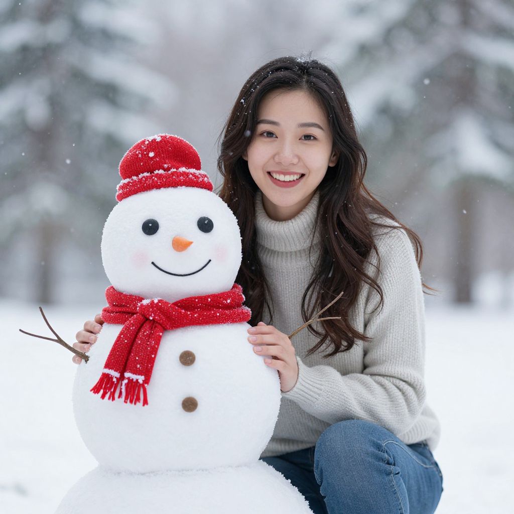 Photograph of a smiling woman with long brown hair, wearing a white puffer jacket with a furry hood, red knit beanie with a brown pom-pom, and beige gloves, hugging a snowman. The snowman has a black top hat, red scarf with white patterns, black buttons, and a carrot nose. The background is a snowy, wooded area with blurred trees and falling snow. The woman's bright smile contrasts with the cold, wintry scene. The snowman's stick arms are visible, and the woman's hand rests on the snowman's right side.